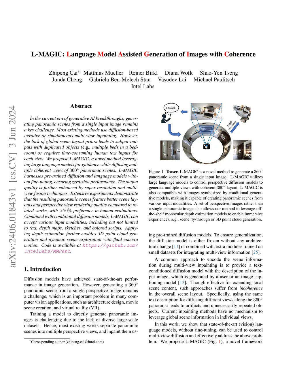 In the current era of generative AI breakthroughs, generating panoramic scenes from a single input image remains a key challenge. Most existing methods use diffusion-based iterative or simultaneous multi-view inpainting. However, the lack of global scene layout priors leads to subpar outputs with duplicated objects (e.g., multiple beds in a bedroom) or requires time-consuming human text inputs for each view. We propose L-MAGIC, a novel method leveraging large language models for guidance while diffusing multiple coherent views of 360 degree panoramic scenes. L-MAGIC harnesses pre-trained diffusion and language models without fine-tuning, ensuring zero-shot performance. The output quality is further enhanced by super-resolution and multi-view fusion techniques. Extensive experiments demonstrate that the resulting panoramic scenes feature better scene layouts and perspective view rendering quality compared to related works, with >70% preference in human evaluations. Combined with conditional diffusion models, L-MAGIC can accept various input modalities, including but not limited to text, depth maps, sketches, and colored scripts. Applying depth estimation further enables 3D point cloud generation and dynamic scene exploration with fluid camera motion. Code is available at https://github.com/IntelLabs/MMPano. The video presentation is available at https://youtu.be/XDMNEzH4-Ec?list=PLG9Zyvu7iBa0-a7ccNLO8LjcVRAoMn57s.