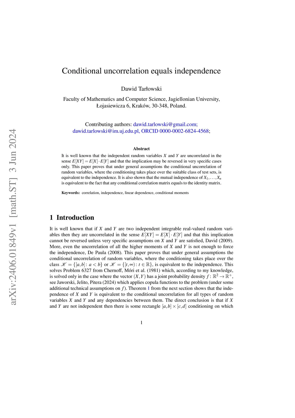 Conditional uncorrelation equals independence
