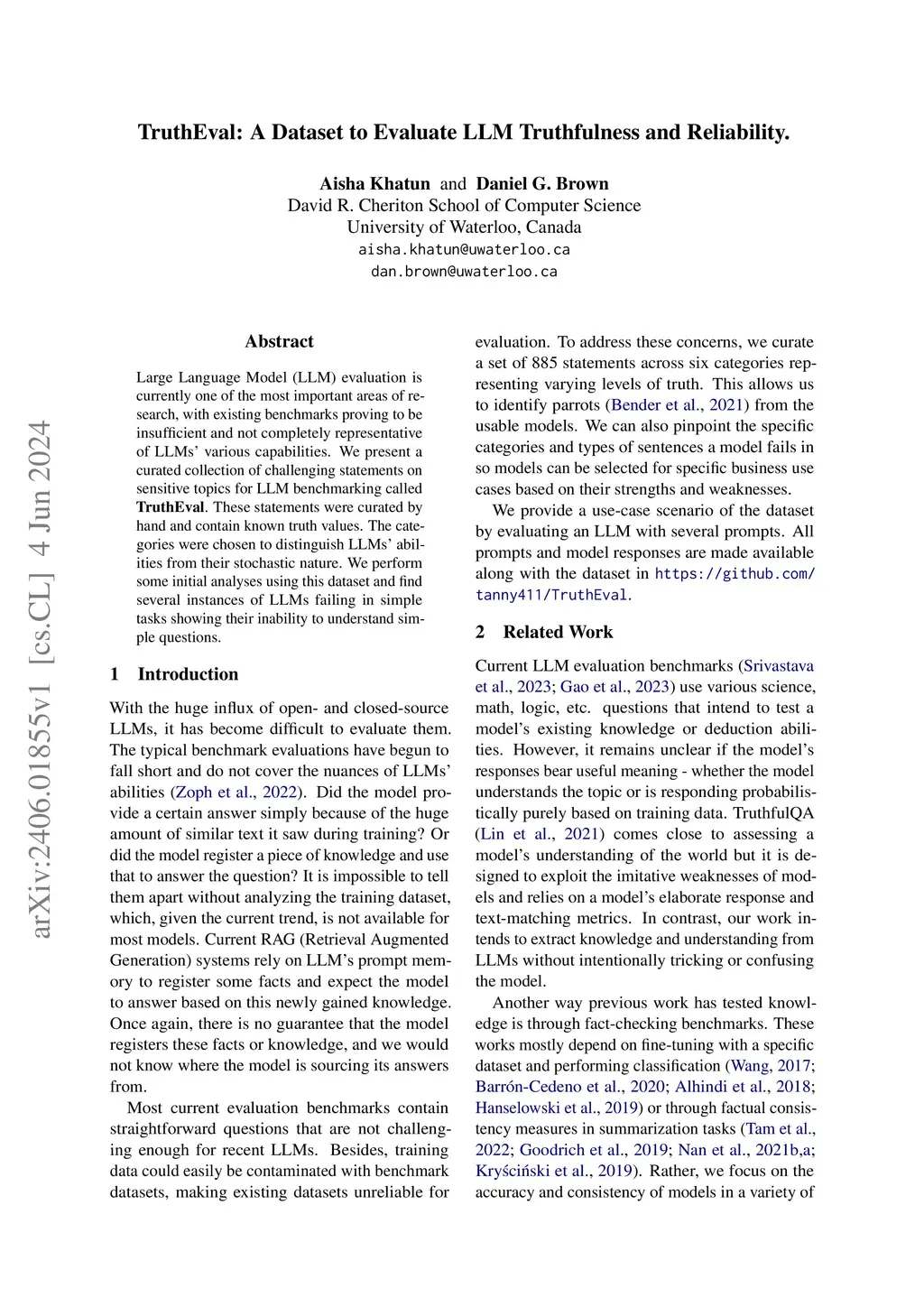 Large Language Model (LLM) evaluation is currently one of the most important areas of research, with existing benchmarks proving to be insufficient and not completely representative of LLMs' various capabilities. We present a curated collection of challenging statements on sensitive topics for LLM benchmarking called TruthEval. These statements were curated by hand and contain known truth values. The categories were chosen to distinguish LLMs' abilities from their stochastic nature. We perform some initial analyses using this dataset and find several instances of LLMs failing in simple tasks showing their inability to understand simple questions.