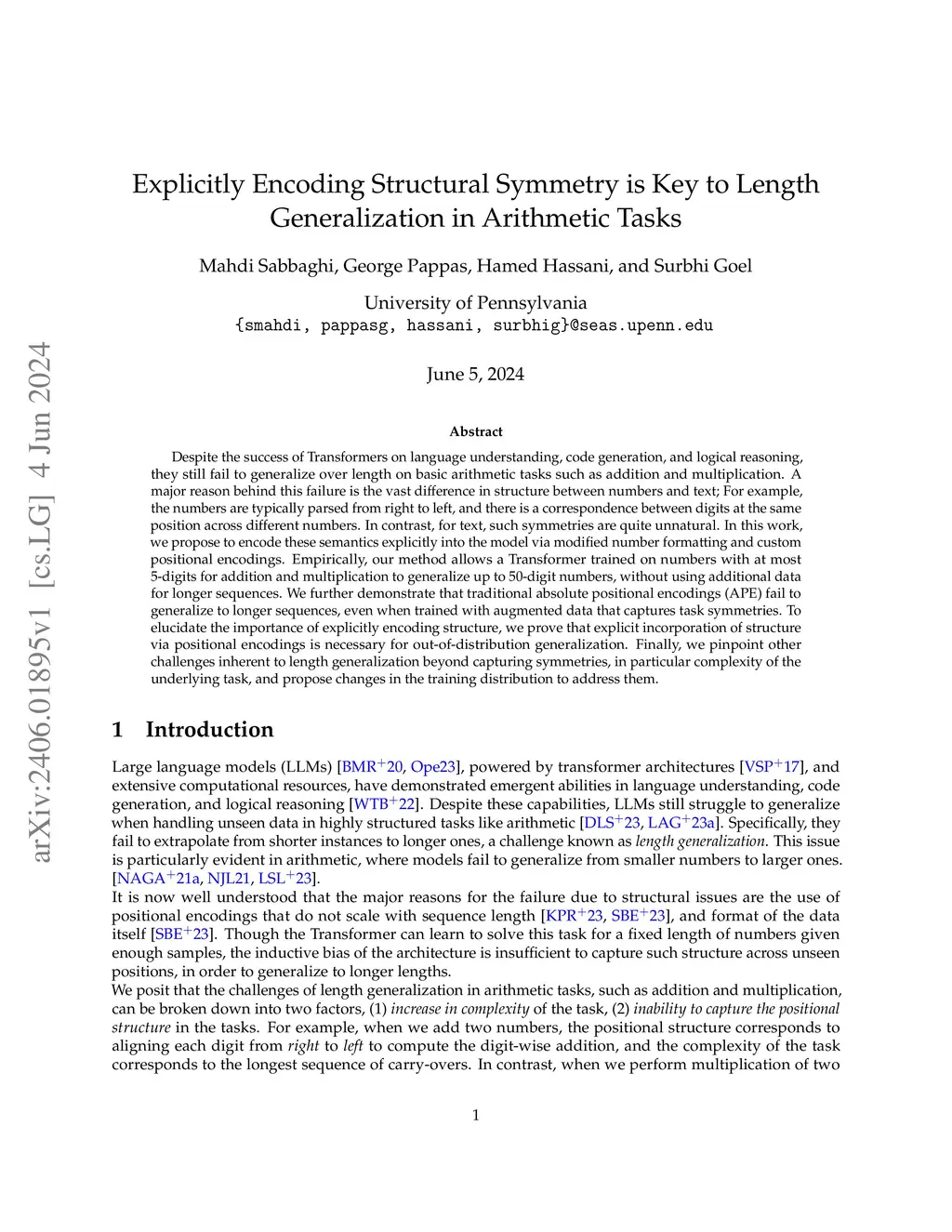 Despite the success of Transformers on language understanding, code generation, and logical reasoning, they still fail to generalize over length on basic arithmetic tasks such as addition and multiplication. A major reason behind this failure is the vast difference in structure between numbers and text; For example, the numbers are typically parsed from right to left, and there is a correspondence between digits at the same position across different numbers. In contrast, for text, such symmetries are quite unnatural. In this work, we propose to encode these semantics explicitly into the model via modified number formatting and custom positional encodings. Empirically, our method allows a Transformer trained on numbers with at most 5-digits for addition and multiplication to generalize up to 50-digit numbers, without using additional data for longer sequences. We further demonstrate that traditional absolute positional encodings (APE) fail to generalize to longer sequences, even when trained with augmented data that captures task symmetries. To elucidate the importance of explicitly encoding structure, we prove that explicit incorporation of structure via positional encodings is necessary for out-of-distribution generalization. Finally, we pinpoint other challenges inherent to length generalization beyond capturing symmetries, in particular complexity of the underlying task, and propose changes in the training distribution to address them.