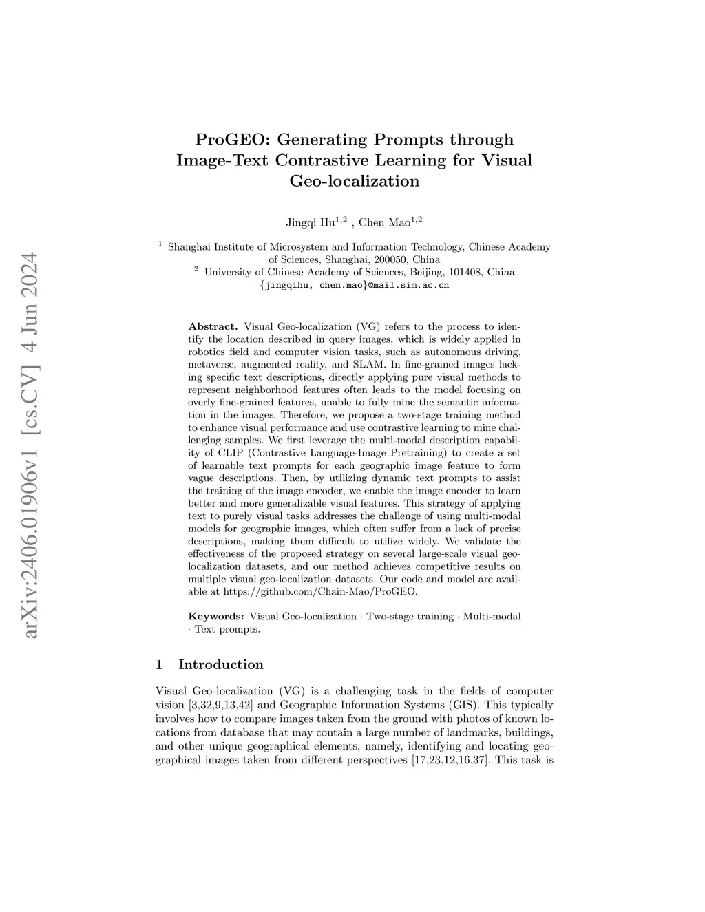 ProGEO: Generating Prompts through Image-Text Contrastive Learning for