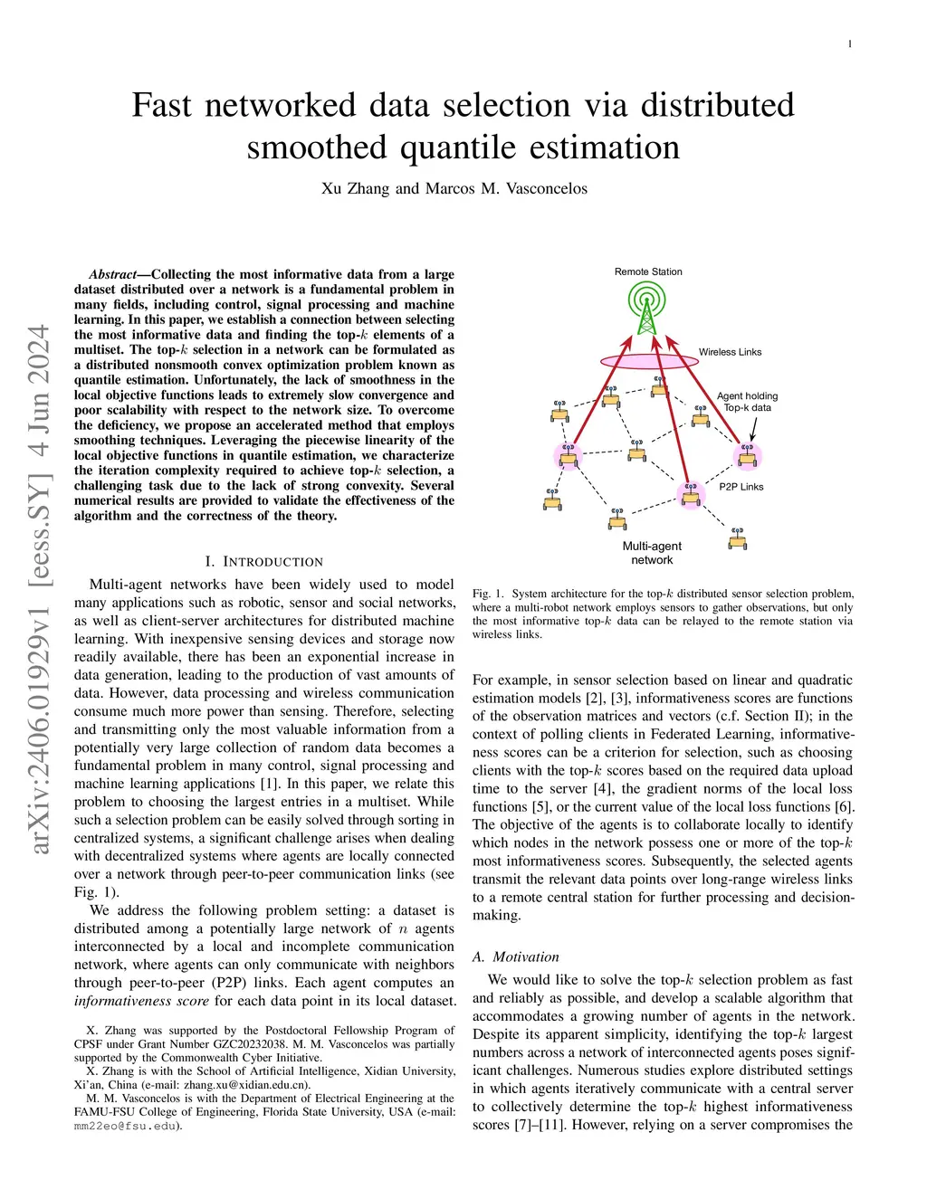 Collecting the most informative data from a large dataset distributed over a network is a fundamental problem in many fields, including control, signal processing and machine learning. In this paper, we establish a connection between selecting the most informative data and finding the top- elements of a multiset. The top- selection in a network can be formulated as a distributed nonsmooth convex optimization problem known as quantile estimation. Unfortunately, the lack of smoothness in the local objective functions leads to extremely slow convergence and poor scalability with respect to the network size. To overcome the deficiency, we propose an accelerated method that employs smoothing techniques. Leveraging the piecewise linearity of the local objective functions in quantile estimation, we characterize the iteration complexity required to achieve top- selection, a challenging task due to the lack of strong convexity. Several numerical results are provided to validate the effectiveness of the algorithm and the correctness of the theory.