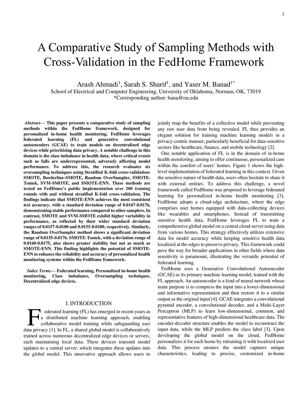This paper presents a comparative study of sampling methods within the FedHome framework, designed for personalized in-home health monitoring. FedHome leverages federated learning (FL) and generative convolutional autoencoders (GCAE) to train models on decentralized edge devices while prioritizing data privacy. A notable challenge in this domain is the class imbalance in health data, where critical events such as falls are underrepresented, adversely affecting model performance. To address this, the research evaluates six oversampling techniques using Stratified K-fold cross-validation: SMOTE, Borderline-SMOTE, Random OverSampler, SMOTE-Tomek, SVM-SMOTE, and SMOTE-ENN. These methods are tested on FedHome's public implementation over 200 training rounds with and without stratified K-fold cross-validation. The findings indicate that SMOTE-ENN achieves the most consistent test accuracy, with a standard deviation range of 0.0167-0.0176, demonstrating stable performance compared to other samplers. In contrast, SMOTE and SVM-SMOTE exhibit higher variability in performance, as reflected by their wider standard deviation ranges of 0.0157-0.0180 and 0.0155-0.0180, respectively. Similarly, the Random OverSampler method shows a significant deviation range of 0.0155-0.0176. SMOTE-Tomek, with a deviation range of 0.0160-0.0175, also shows greater stability but not as much as SMOTE-ENN. This finding highlights the potential of SMOTE-ENN to enhance the reliability and accuracy of personalized health monitoring systems within the FedHome framework.