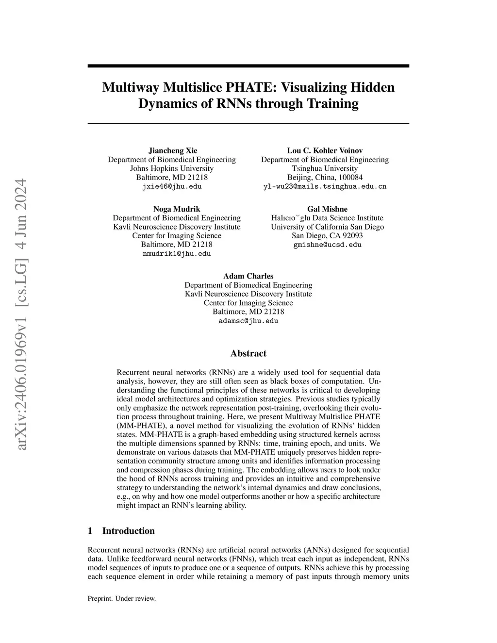 Recurrent neural networks (RNNs) are a widely used tool for sequential data analysis, however, they are still often seen as black boxes of computation. Understanding the functional principles of these networks is critical to developing ideal model architectures and optimization strategies. Previous studies typically only emphasize the network representation post-training, overlooking their evolution process throughout training. Here, we present Multiway Multislice PHATE (MM-PHATE), a novel method for visualizing the evolution of RNNs' hidden states. MM-PHATE is a graph-based embedding using structured kernels across the multiple dimensions spanned by RNNs: time, training epoch, and units. We demonstrate on various datasets that MM-PHATE uniquely preserves hidden representation community structure among units and identifies information processing and compression phases during training. The embedding allows users to look under the hood of RNNs across training and provides an intuitive and comprehensive strategy to understanding the network's internal dynamics and draw conclusions, e.g., on why and how one model outperforms another or how a specific architecture might impact an RNN's learning ability.