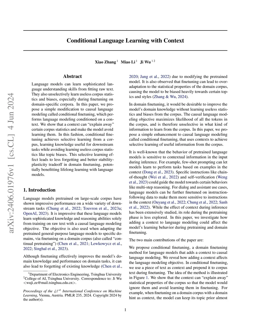 Language models can learn sophisticated language understanding skills from fitting raw text. They also unselectively learn useless corpus statistics and biases, especially during finetuning on domain-specific corpora. In this paper, we propose a simple modification to causal language modeling called conditional finetuning, which performs language modeling conditioned on a context. We show that a context can "explain away" certain corpus statistics and make the model avoid learning them. In this fashion, conditional finetuning achieves selective learning from a corpus, learning knowledge useful for downstream tasks while avoiding learning useless corpus statistics like topic biases. This selective learning effect leads to less forgetting and better stability-plasticity tradeoff in domain finetuning, potentially benefitting lifelong learning with language models.