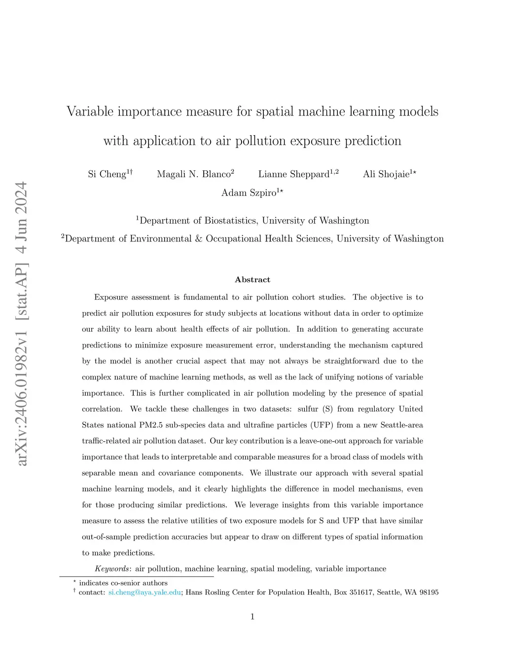 Exposure assessment is fundamental to air pollution cohort studies. The objective is to predict air pollution exposures for study subjects at locations without data in order to optimize our ability to learn about health effects of air pollution. In addition to generating accurate predictions to minimize exposure measurement error, understanding the mechanism captured by the model is another crucial aspect that may not always be straightforward due to the complex nature of machine learning methods, as well as the lack of unifying notions of variable importance. This is further complicated in air pollution modeling by the presence of spatial correlation. We tackle these challenges in two datasets: sulfur (S) from regulatory United States national PM2.5 sub-species data and ultrafine particles (UFP) from a new Seattle-area traffic-related air pollution dataset. Our key contribution is a leave-one-out approach for variable importance that leads to interpretable and comparable measures for a broad class of models with separable mean and covariance components. We illustrate our approach with several spatial machine learning models, and it clearly highlights the difference in model mechanisms, even for those producing similar predictions. We leverage insights from this variable importance measure to assess the relative utilities of two exposure models for S and UFP that have similar out-of-sample prediction accuracies but appear to draw on different types of spatial information to make predictions.