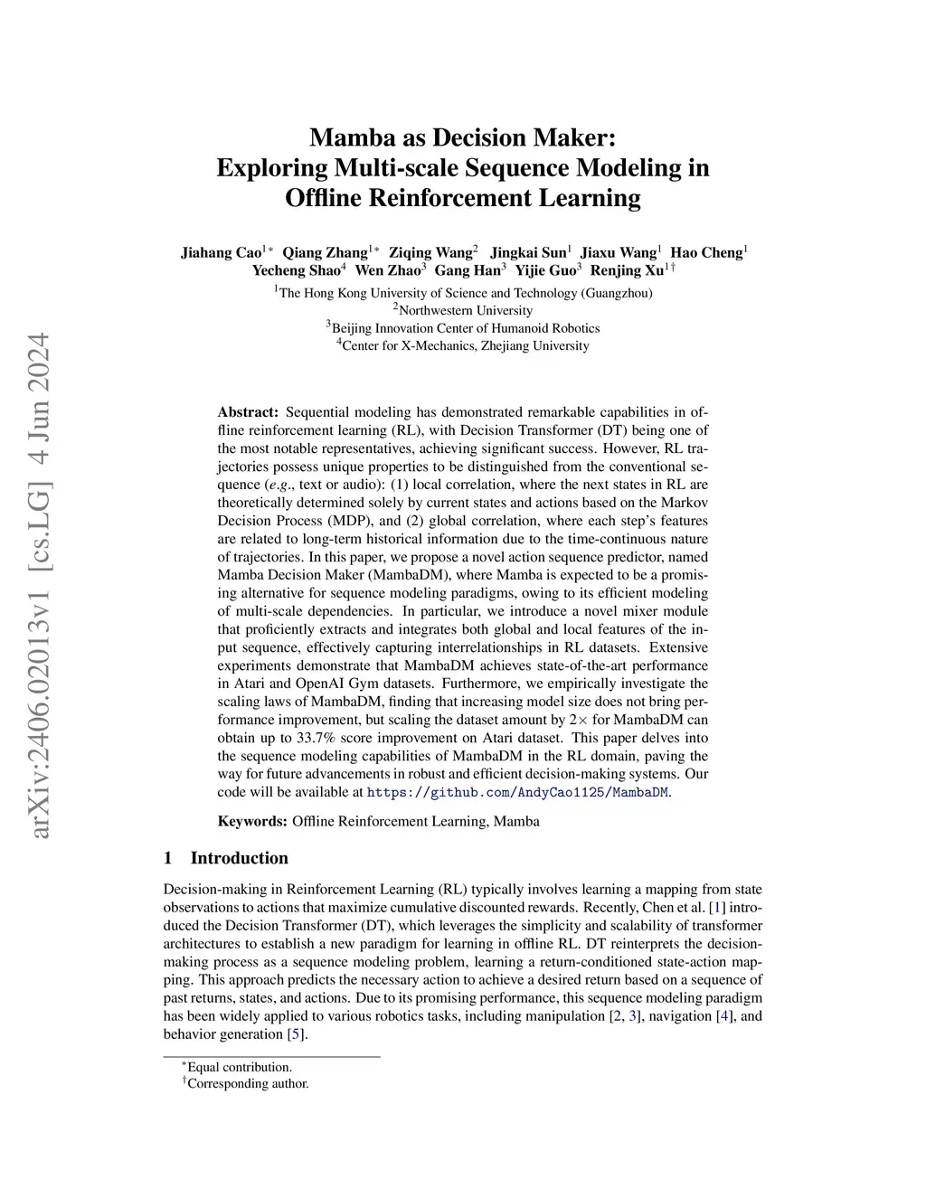 Sequential modeling has demonstrated remarkable capabilities in offline reinforcement learning (RL), with Decision Transformer (DT) being one of the most notable representatives, achieving significant success. However, RL trajectories possess unique properties to be distinguished from the conventional sequence (e.g., text or audio): (1) local correlation, where the next states in RL are theoretically determined solely by current states and actions based on the Markov Decision Process (MDP), and (2) global correlation, where each step's features are related to long-term historical information due to the time-continuous nature of trajectories. In this paper, we propose a novel action sequence predictor, named Mamba Decision Maker (MambaDM), where Mamba is expected to be a promising alternative for sequence modeling paradigms, owing to its efficient modeling of multi-scale dependencies. In particular, we introduce a novel mixer module that proficiently extracts and integrates both global and local features of the input sequence, effectively capturing interrelationships in RL datasets. Extensive experiments demonstrate that MambaDM achieves state-of-the-art performance in Atari and OpenAI Gym datasets. Furthermore, we empirically investigate the scaling laws of MambaDM, finding that increasing model size does not bring performance improvement, but scaling the dataset amount by 2x for MambaDM can obtain up to 33.7% score improvement on Atari dataset. This paper delves into the sequence modeling capabilities of MambaDM in the RL domain, paving the way for future advancements in robust and efficient decision-making systems. Our code will be available at https://github.com/AndyCao1125/MambaDM.