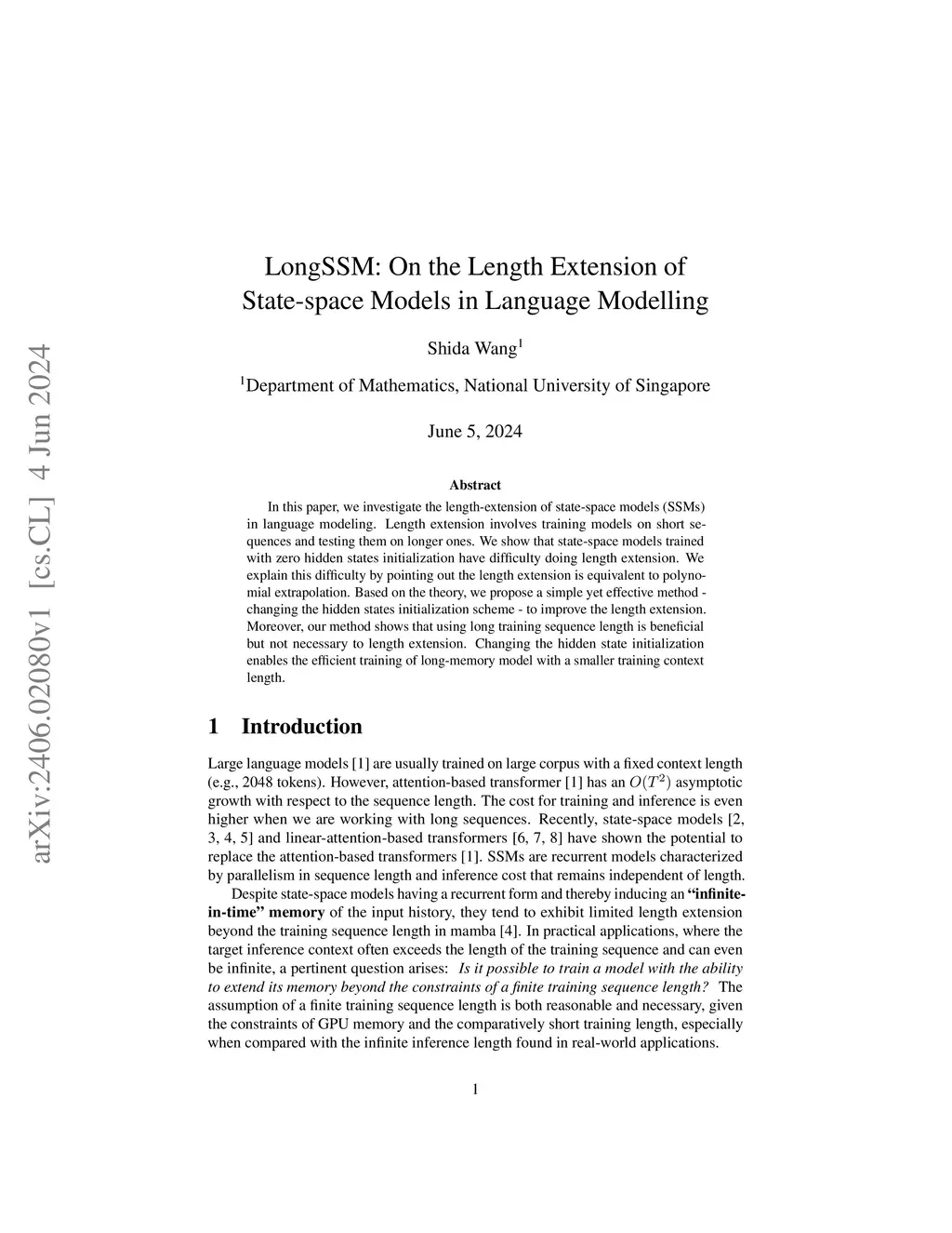 In this paper, we investigate the length-extension of state-space models (SSMs) in language modeling. Length extension involves training models on short sequences and testing them on longer ones. We show that state-space models trained with zero hidden states initialization have difficulty doing length extension. We explain this difficulty by pointing out the length extension is equivalent to polynomial extrapolation. Based on the theory, we propose a simple yet effective method - changing the hidden states initialization scheme - to improve the length extension. Moreover, our method shows that using long training sequence length is beneficial but not necessary to length extension. Changing the hidden state initialization enables the efficient training of long-memory model with a smaller training context length.