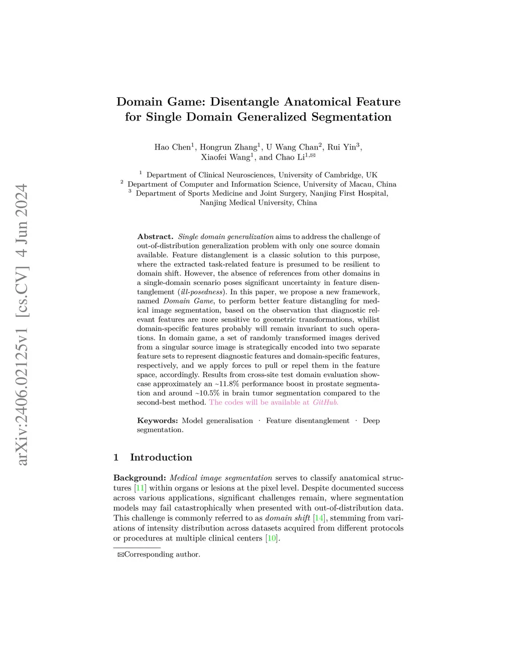 Domain Game: Disentangle Anatomical Feature for Single Domain