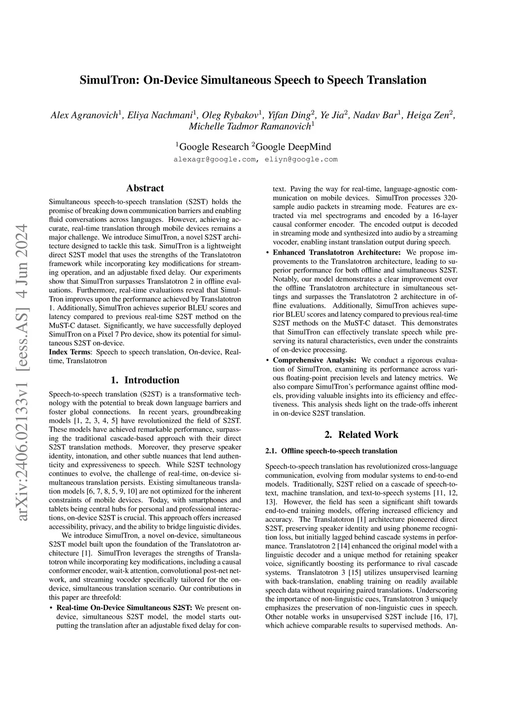 Simultaneous speech-to-speech translation (S2ST) holds the promise of breaking down communication barriers and enabling fluid conversations across languages. However, achieving accurate, real-time translation through mobile devices remains a major challenge. We introduce SimulTron, a novel S2ST architecture designed to tackle this task. SimulTron is a lightweight direct S2ST model that uses the strengths of the Translatotron framework while incorporating key modifications for streaming operation, and an adjustable fixed delay. Our experiments show that SimulTron surpasses Translatotron 2 in offline evaluations. Furthermore, real-time evaluations reveal that SimulTron improves upon the performance achieved by Translatotron 1. Additionally, SimulTron achieves superior BLEU scores and latency compared to previous real-time S2ST method on the MuST-C dataset. Significantly, we have successfully deployed SimulTron on a Pixel 7 Pro device, show its potential for simultaneous S2ST on-device.