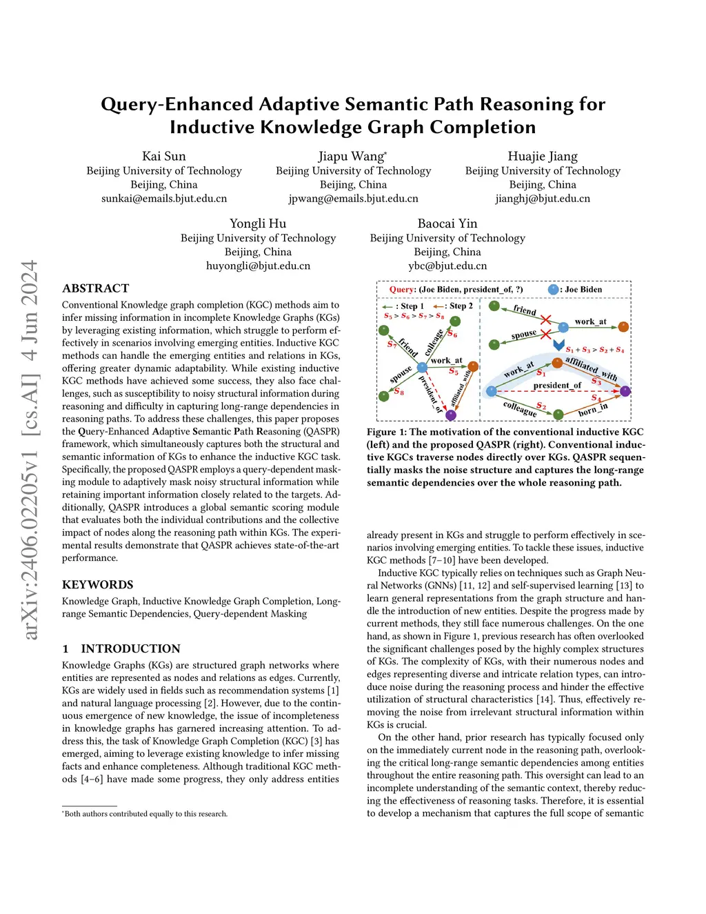 Conventional Knowledge graph completion (KGC) methods aim to infer missing information in incomplete Knowledge Graphs (KGs) by leveraging existing information, which struggle to perform effectively in scenarios involving emerging entities. Inductive KGC methods can handle the emerging entities and relations in KGs, offering greater dynamic adaptability. While existing inductive KGC methods have achieved some success, they also face challenges, such as susceptibility to noisy structural information during reasoning and difficulty in capturing long-range dependencies in reasoning paths. To address these challenges, this paper proposes the Query-Enhanced Adaptive Semantic Path Reasoning (QASPR) framework, which simultaneously captures both the structural and semantic information of KGs to enhance the inductive KGC task. Specifically, the proposed QASPR employs a query-dependent masking module to adaptively mask noisy structural information while retaining important information closely related to the targets. Additionally, QASPR introduces a global semantic scoring module that evaluates both the individual contributions and the collective impact of nodes along the reasoning path within KGs. The experimental results demonstrate that QASPR achieves state-of-the-art performance.