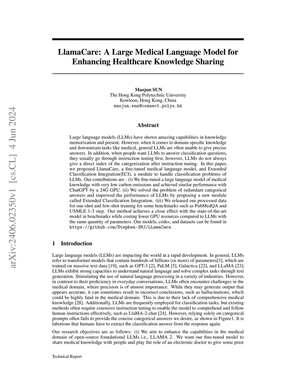 Large language models (LLMs) have shown amazing capabilities in knowledge memorization and the present. However, when it comes to domain-specific knowledge and downstream tasks like medical, general LLMs are often unable to give precise answers. In addition, when people want LLMs to answer classification questions, they usually go through instruction tuning first. However, LLMs do not always give a direct index of the categorization after instruction tuning. In this paper, we proposed LlamaCare, a fine-tuned medical language model, and Extended Classification Integration(ECI), a module to handle classification problems of LLMs. Our contributions are : (i) We fine-tuned a large language model of medical knowledge with very low carbon emissions and achieved similar performance with ChatGPT by a 24G GPU. (ii) We solved the problem of redundant categorical answers and improved the performance of LLMs by proposing a new module called Extended Classification Integration. (iii) We released our processed data for one-shot and few-shot training for some benchmarks such as PubMedQA and USMLE 1-3 step. Our method achieves a close performance comparable to some state-of-the-art models with the same quantity of parameters on benchmarks, while being more environmentally friendly by using less GPU computation time. Our models, codes, and datasets can be found at \url{https://github.com/Stephen-SMJ/LLamaCare}.