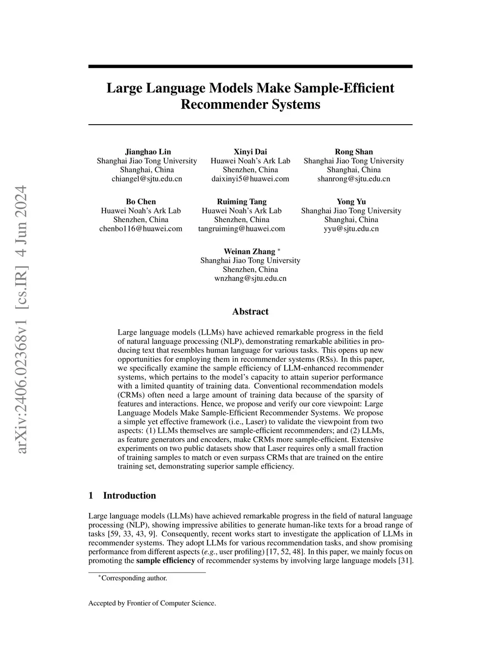 Large language models (LLMs) have achieved remarkable progress in the field of natural language processing (NLP), demonstrating remarkable abilities in producing text that resembles human language for various tasks. This opens up new opportunities for employing them in recommender systems (RSs). In this paper, we specifically examine the sample efficiency of LLM-enhanced recommender systems, which pertains to the model's capacity to attain superior performance with a limited quantity of training data. Conventional recommendation models (CRMs) often need a large amount of training data because of the sparsity of features and interactions. Hence, we propose and verify our core viewpoint: Large Language Models Make Sample-Efficient Recommender Systems. We propose a simple yet effective framework (i.e., Laser) to validate the viewpoint from two aspects: (1) LLMs themselves are sample-efficient recommenders; and (2) LLMs, as feature generators and encoders, make CRMs more sample-efficient. Extensive experiments on two public datasets show that Laser requires only a small fraction of training samples to match or even surpass CRMs that are trained on the entire training set, demonstrating superior sample efficiency.