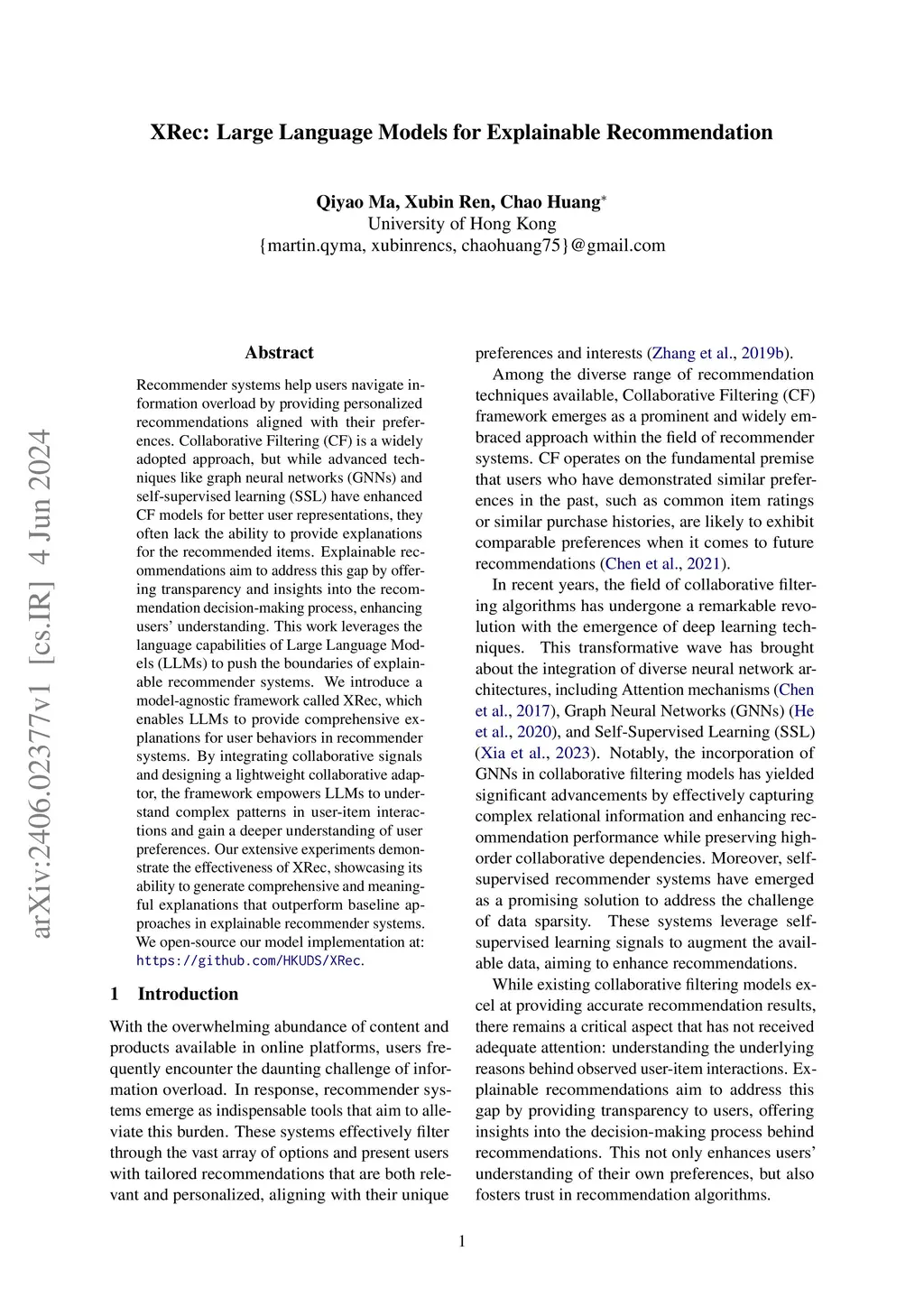 XRec: Large Language Models for Explainable Recommendation