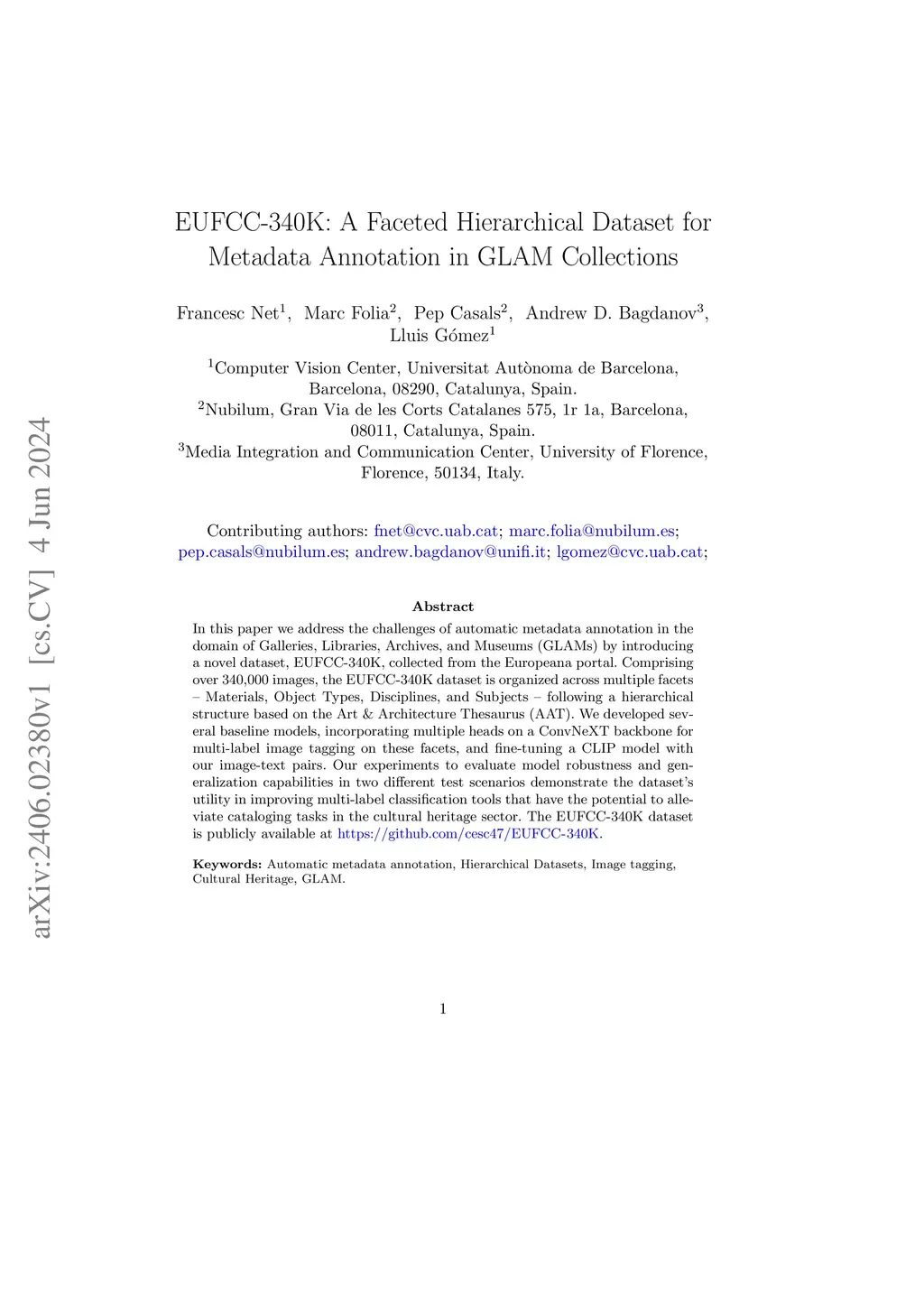 In this paper, we address the challenges of automatic metadata annotation in the domain of Galleries, Libraries, Archives, and Museums (GLAMs) by introducing a novel dataset, EUFCC340K, collected from the Europeana portal. Comprising over 340,000 images, the EUFCC340K dataset is organized across multiple facets: Materials, Object Types, Disciplines, and Subjects, following a hierarchical structure based on the Art & Architecture Thesaurus (AAT). We developed several baseline models, incorporating multiple heads on a ConvNeXT backbone for multi-label image tagging on these facets, and fine-tuning a CLIP model with our image text pairs. Our experiments to evaluate model robustness and generalization capabilities in two different test scenarios demonstrate the utility of the dataset in improving multi-label classification tools that have the potential to alleviate cataloging tasks in the cultural heritage sector.
