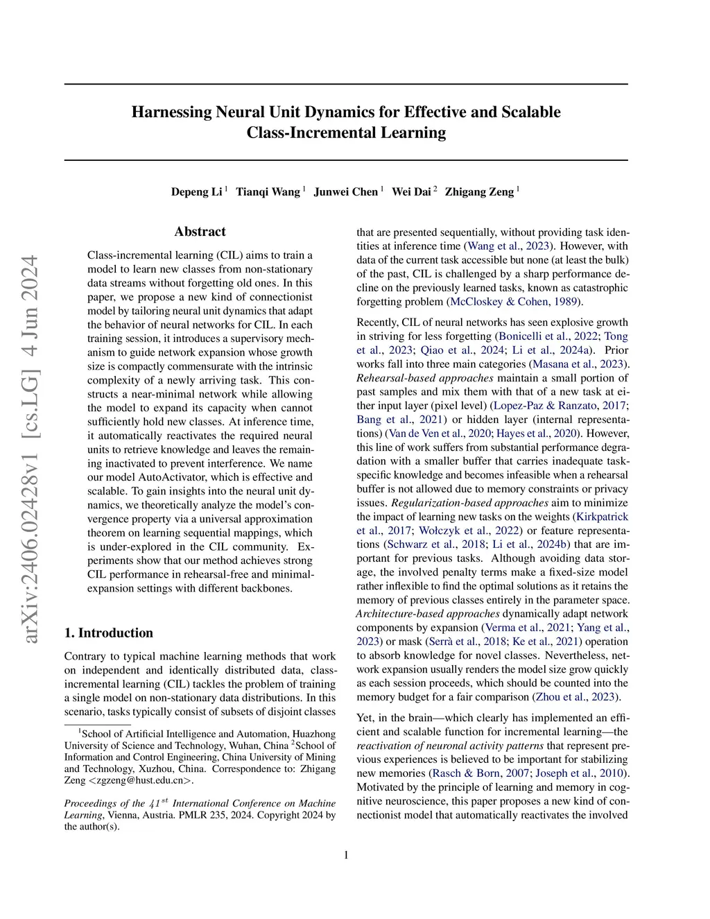 Class-incremental learning (CIL) aims to train a model to learn new classes from non-stationary data streams without forgetting old ones. In this paper, we propose a new kind of connectionist model by tailoring neural unit dynamics that adapt the behavior of neural networks for CIL. In each training session, it introduces a supervisory mechanism to guide network expansion whose growth size is compactly commensurate with the intrinsic complexity of a newly arriving task. This constructs a near-minimal network while allowing the model to expand its capacity when cannot sufficiently hold new classes. At inference time, it automatically reactivates the required neural units to retrieve knowledge and leaves the remaining inactivated to prevent interference. We name our model AutoActivator, which is effective and scalable. To gain insights into the neural unit dynamics, we theoretically analyze the model's convergence property via a universal approximation theorem on learning sequential mappings, which is under-explored in the CIL community. Experiments show that our method achieves strong CIL performance in rehearsal-free and minimal-expansion settings with different backbones.