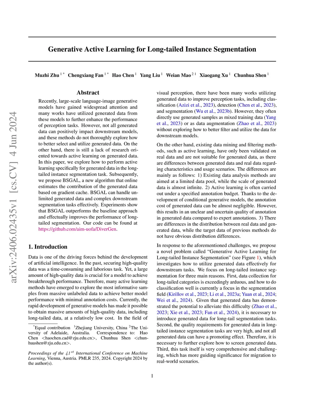 Recently, large-scale language-image generative models have gained widespread attention and many works have utilized generated data from these models to further enhance the performance of perception tasks. However, not all generated data can positively impact downstream models, and these methods do not thoroughly explore how to better select and utilize generated data. On the other hand, there is still a lack of research oriented towards active learning on generated data. In this paper, we explore how to perform active learning specifically for generated data in the long-tailed instance segmentation task. Subsequently, we propose BSGAL, a new algorithm that online estimates the contribution of the generated data based on gradient cache. BSGAL can handle unlimited generated data and complex downstream segmentation tasks effectively. Experiments show that BSGAL outperforms the baseline approach and effectually improves the performance of long-tailed segmentation. Our code can be found at https://github.com/aim-uofa/DiverGen.