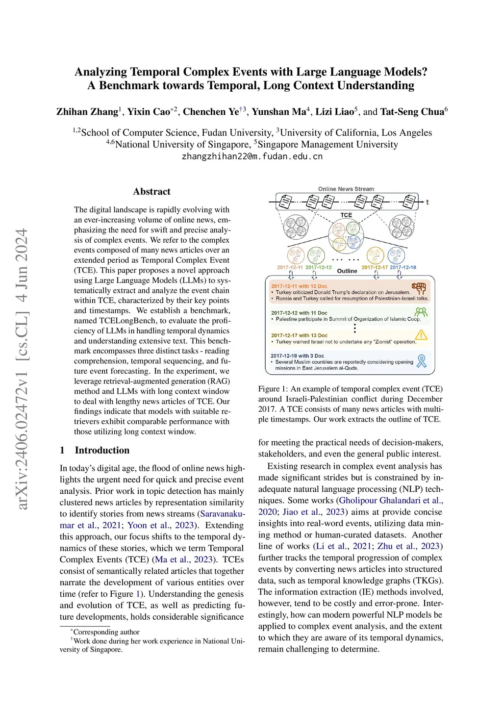 The digital landscape is rapidly evolving with an ever-increasing volume of online news, emphasizing the need for swift and precise analysis of complex events. We refer to the complex events composed of many news articles over an extended period as Temporal Complex Event (TCE). This paper proposes a novel approach using Large Language Models (LLMs) to systematically extract and analyze the event chain within TCE, characterized by their key points and timestamps. We establish a benchmark, named TCELongBench, to evaluate the proficiency of LLMs in handling temporal dynamics and understanding extensive text. This benchmark encompasses three distinct tasks - reading comprehension, temporal sequencing, and future event forecasting. In the experiment, we leverage retrieval-augmented generation (RAG) method and LLMs with long context window to deal with lengthy news articles of TCE. Our findings indicate that models with suitable retrievers exhibit comparable performance with those utilizing long context window.