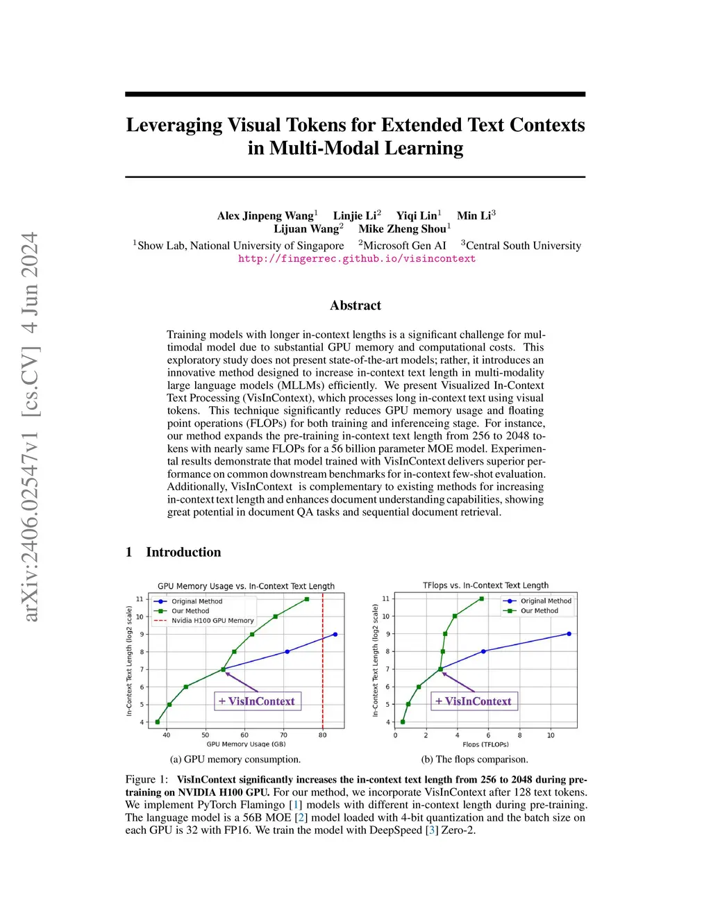 Training models with longer in-context lengths is a significant challenge for multimodal model due to substantial GPU memory and computational costs. This exploratory study does not present state-of-the-art models; rather, it introduces an innovative method designed to increase in-context text length in multi-modality large language models (MLLMs) efficiently. We present Visualized In-Context Text Processing (VisInContext), which processes long in-context text using visual tokens. This technique significantly reduces GPU memory usage and floating point operations (FLOPs) for both training and inferenceing stage. For instance, our method expands the pre-training in-context text length from 256 to 2048 tokens with nearly same FLOPs for a 56 billion parameter MOE model. Experimental results demonstrate that model trained with VisInContext delivers superior performance on common downstream benchmarks for in-context few-shot evaluation. Additionally, VisInContext is complementary to existing methods for increasing in-context text length and enhances document understanding capabilities, showing great potential in document QA tasks and sequential document retrieval.