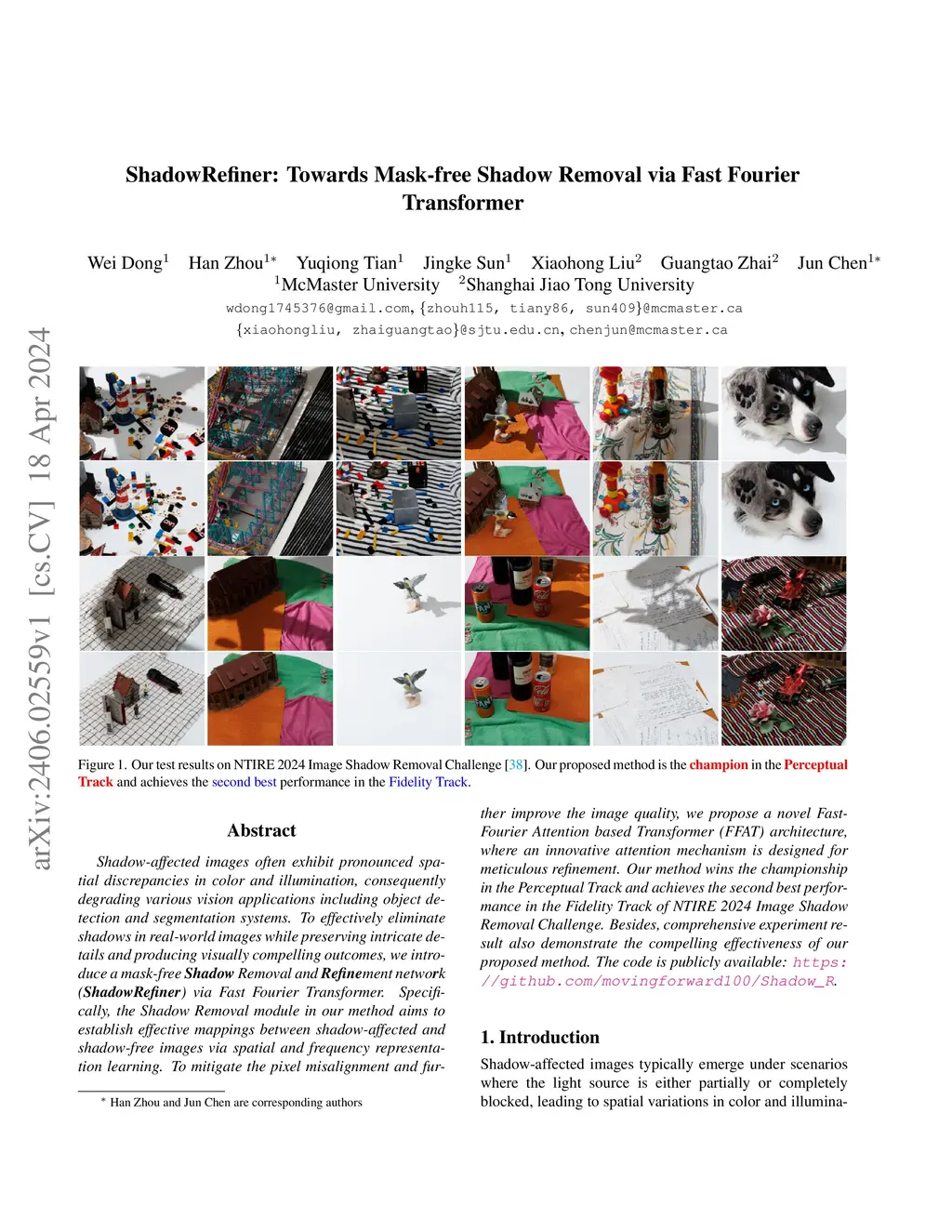 Shadow-affected images often exhibit pronounced spatial discrepancies in color and illumination, consequently degrading various vision applications including object detection and segmentation systems. To effectively eliminate shadows in real-world images while preserving intricate details and producing visually compelling outcomes, we introduce a mask-free Shadow Removal and Refinement network (ShadowRefiner) via Fast Fourier Transformer. Specifically, the Shadow Removal module in our method aims to establish effective mappings between shadow-affected and shadow-free images via spatial and frequency representation learning. To mitigate the pixel misalignment and further improve the image quality, we propose a novel Fast-Fourier Attention based Transformer (FFAT) architecture, where an innovative attention mechanism is designed for meticulous refinement. Our method wins the championship in the Perceptual Track and achieves the second best performance in the Fidelity Track of NTIRE 2024 Image Shadow Removal Challenge. Besides, comprehensive experiment result also demonstrate the compelling effectiveness of our proposed method. The code is publicly available: https://github.com/movingforward100/Shadow_R.