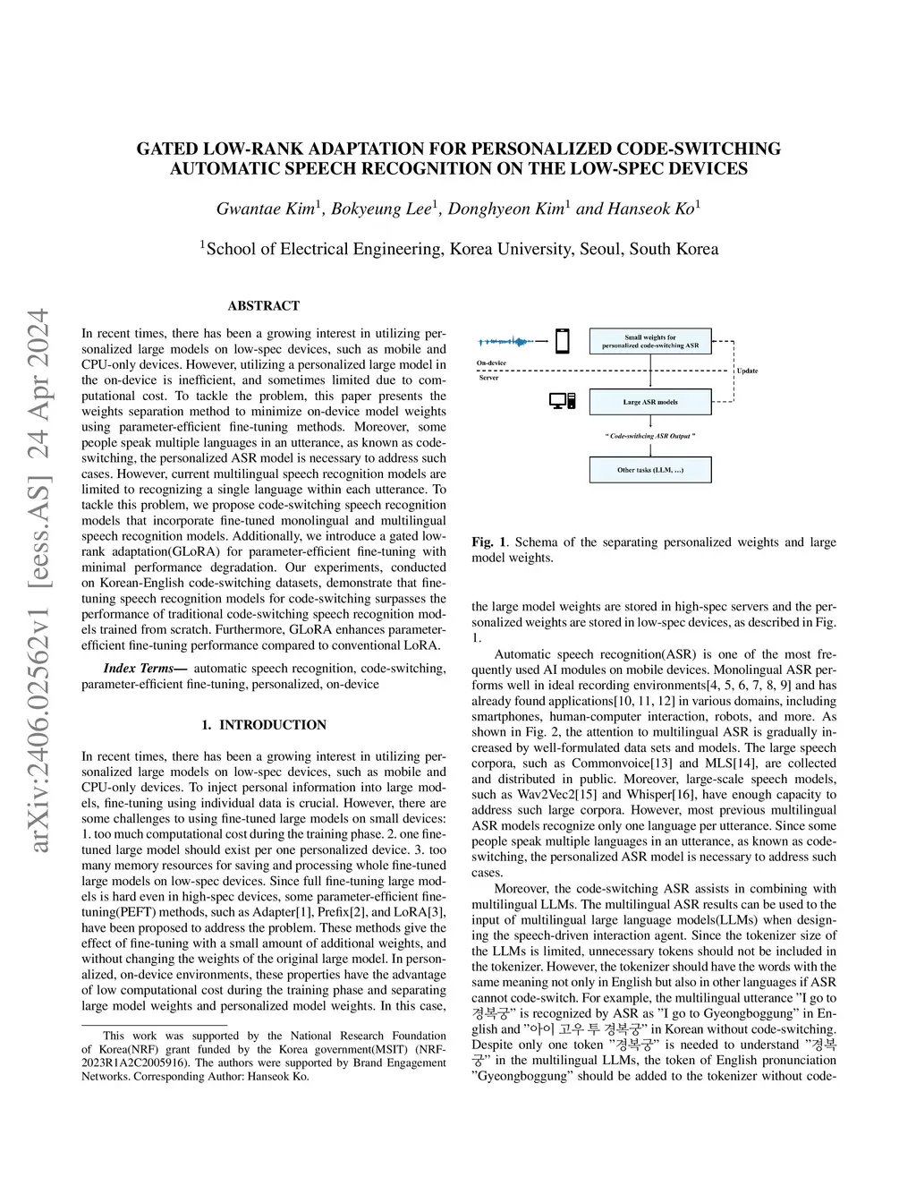 In recent times, there has been a growing interest in utilizing personalized large models on low-spec devices, such as mobile and CPU-only devices. However, utilizing a personalized large model in the on-device is inefficient, and sometimes limited due to computational cost. To tackle the problem, this paper presents the weights separation method to minimize on-device model weights using parameter-efficient fine-tuning methods. Moreover, some people speak multiple languages in an utterance, as known as code-switching, the personalized ASR model is necessary to address such cases. However, current multilingual speech recognition models are limited to recognizing a single language within each utterance. To tackle this problem, we propose code-switching speech recognition models that incorporate fine-tuned monolingual and multilingual speech recognition models. Additionally, we introduce a gated low-rank adaptation(GLoRA) for parameter-efficient fine-tuning with minimal performance degradation. Our experiments, conducted on Korean-English code-switching datasets, demonstrate that fine-tuning speech recognition models for code-switching surpasses the performance of traditional code-switching speech recognition models trained from scratch. Furthermore, GLoRA enhances parameter-efficient fine-tuning performance compared to conventional LoRA.