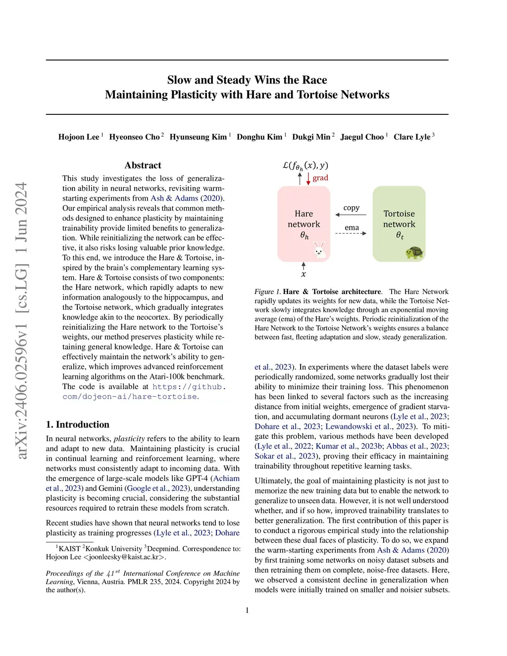 This study investigates the loss of generalization ability in neural networks, revisiting warm-starting experiments from Ash & Adams. Our empirical analysis reveals that common methods designed to enhance plasticity by maintaining trainability provide limited benefits to generalization. While reinitializing the network can be effective, it also risks losing valuable prior knowledge. To this end, we introduce the Hare & Tortoise, inspired by the brain's complementary learning system. Hare & Tortoise consists of two components: the Hare network, which rapidly adapts to new information analogously to the hippocampus, and the Tortoise network, which gradually integrates knowledge akin to the neocortex. By periodically reinitializing the Hare network to the Tortoise's weights, our method preserves plasticity while retaining general knowledge. Hare & Tortoise can effectively maintain the network's ability to generalize, which improves advanced reinforcement learning algorithms on the Atari-100k benchmark. The code is available atthis https URL.