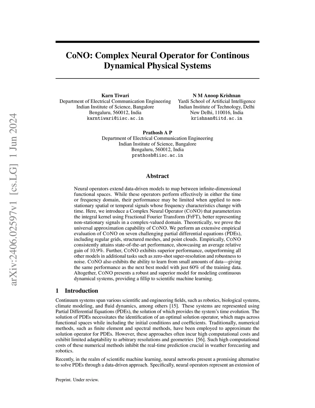 Neural operators extend data-driven models to map between infinite-dimensional functional spaces. While these operators perform effectively in either the time or frequency domain, their performance may be limited when applied to non-stationary spatial or temporal signals whose frequency characteristics change with time. Here, we introduce Complex Neural Operator (CoNO) that parameterizes the integral kernel using Fractional Fourier Transform (FrFT), better representing non-stationary signals in a complex-valued domain. Theoretically, we prove the universal approximation capability of CoNO. We perform an extensive empirical evaluation of CoNO on seven challenging partial differential equations (PDEs), including regular grids, structured meshes, and point clouds. Empirically, CoNO consistently attains state-of-the-art performance, showcasing an average relative gain of 10.9%. Further, CoNO exhibits superior performance, outperforming all other models in additional tasks such as zero-shot super-resolution and robustness to noise. CoNO also exhibits the ability to learn from small amounts of data -- giving the same performance as the next best model with just 60% of the training data. Altogether, CoNO presents a robust and superior model for modeling continuous dynamical systems, providing a fillip to scientific machine learning.
