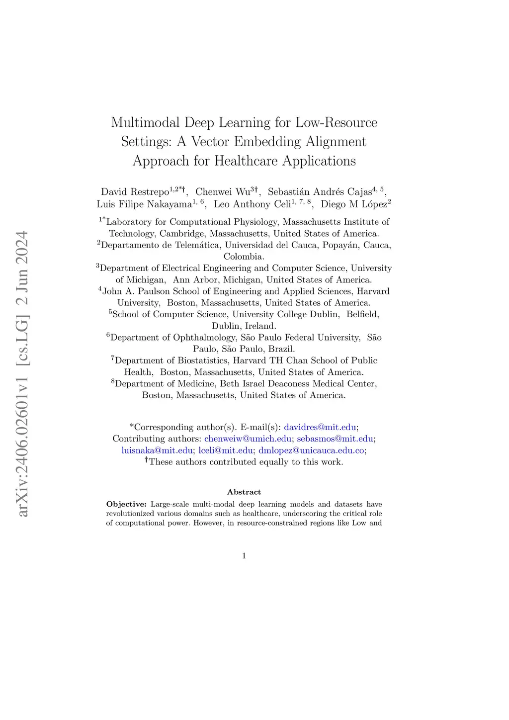 Large-scale multi-modal deep learning models have revolutionized domains such as healthcare, highlighting the importance of computational power. However, in resource-constrained regions like Low and Middle-Income Countries (LMICs), limited access to GPUs and data poses significant challenges, often leaving CPUs as the sole resource. To address this, we advocate for leveraging vector embeddings to enable flexible and efficient computational methodologies, democratizing multimodal deep learning across diverse contexts. Our paper investigates the efficiency and effectiveness of using vector embeddings from single-modal foundation models and multi-modal Vision-Language Models (VLMs) for multimodal deep learning in low-resource environments, particularly in healthcare. Additionally, we propose a simple yet effective inference-time method to enhance performance by aligning image-text embeddings. Comparing these approaches with traditional methods, we assess their impact on computational efficiency and model performance using metrics like accuracy, F1-score, inference time, training time, and memory usage across three medical modalities: BRSET (ophthalmology), HAM10000 (dermatology), and SatelliteBench (public health). Our findings show that embeddings reduce computational demands without compromising model performance. Furthermore, our alignment method improves performance in medical tasks. This research promotes sustainable AI practices by optimizing resources in constrained environments, highlighting the potential of embedding-based approaches for efficient multimodal learning. Vector embeddings democratize multimodal deep learning in LMICs, particularly in healthcare, enhancing AI adaptability in varied use cases.