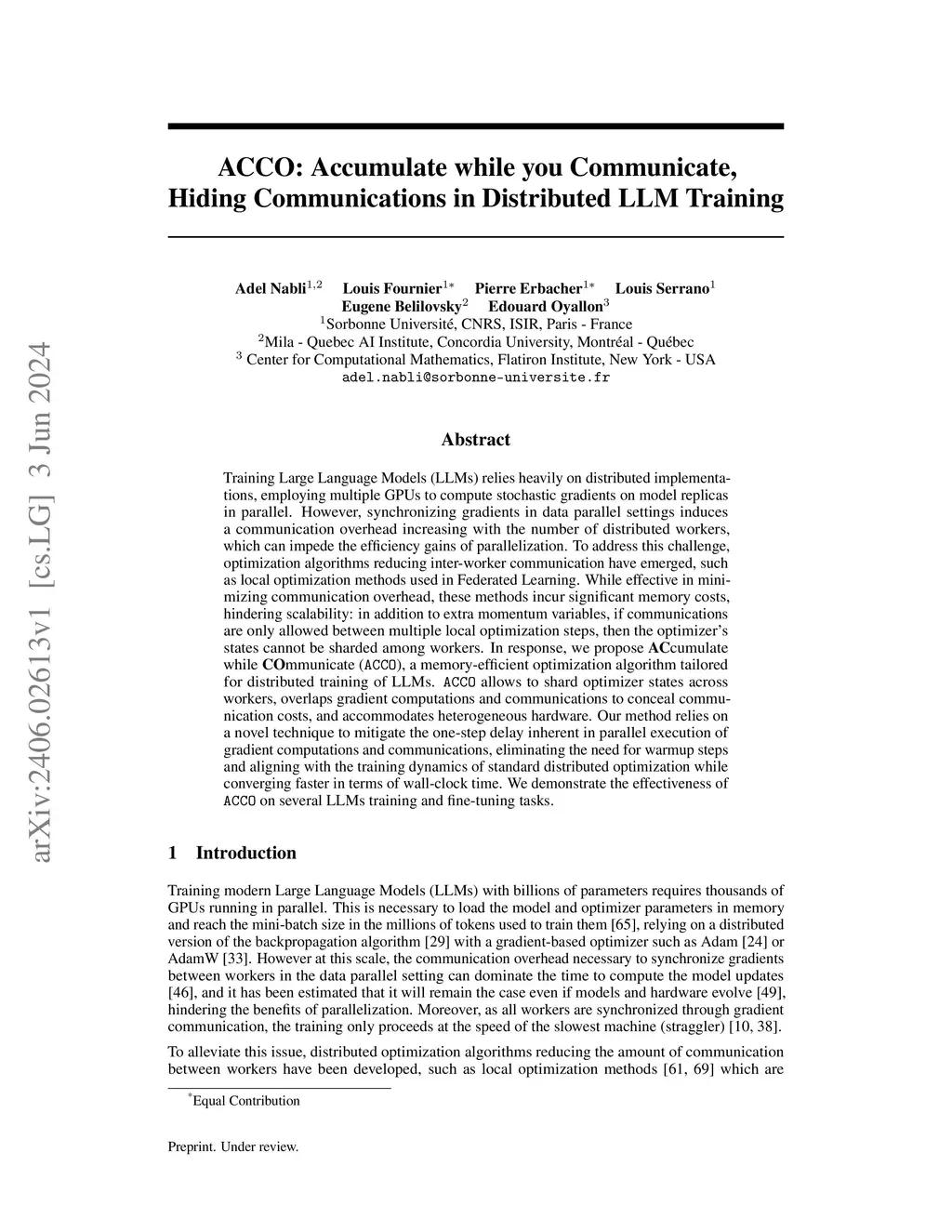 Training LLMs relies on distributed implementations using multiple GPUs to compute gradients in parallel with sharded optimizers. However, synchronizing gradients in data parallel setups introduces communication overhead that grows with the number of workers, limiting parallelization efficiency. Local optimization algorithms reduce communications but incur high memory costs as they prevent optimizer state sharding, hindering scalability. To address this, we propose \textbf{AC}cumulate while \textbf{CO}mmunicate (ACCO), a memory-efficient optimization algorithm for distributed LLM training. By synchronizing delayed gradients while computing new ones, ACCO reduces GPU idle time and supports heterogeneous hardware. To mitigate the convergence issues caused by delayed updates, we introduce a novel technique ensuring training dynamics align with standard distributed optimization. Compared to ZeRO-1, our approach is significantly faster and scales effectively across heterogeneous hardware.
