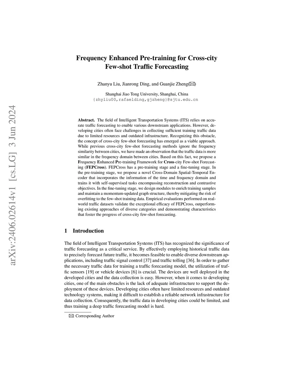 The field of Intelligent Transportation Systems (ITS) relies on accurate traffic forecasting to enable various downstream applications. However, developing cities often face challenges in collecting sufficient training traffic data due to limited resources and outdated infrastructure. Recognizing this obstacle, the concept of cross-city few-shot forecasting has emerged as a viable approach. While previous cross-city few-shot forecasting methods ignore the frequency similarity between cities, we have made an observation that the traffic data is more similar in the frequency domain between cities. Based on this fact, we propose a \textbf{F}requency \textbf{E}nhanced \textbf{P}re-training Framework for \textbf{Cross}-city Few-shot Forecasting (\textbf{FEPCross}). FEPCross has a pre-training stage and a fine-tuning stage. In the pre-training stage, we propose a novel Cross-Domain Spatial-Temporal Encoder that incorporates the information of the time and frequency domain and trains it with self-supervised tasks encompassing reconstruction and contrastive objectives. In the fine-tuning stage, we design modules to enrich training samples and maintain a momentum-updated graph structure, thereby mitigating the risk of overfitting to the few-shot training data. Empirical evaluations performed on real-world traffic datasets validate the exceptional efficacy of FEPCross, outperforming existing approaches of diverse categories and demonstrating characteristics that foster the progress of cross-city few-shot forecasting.
