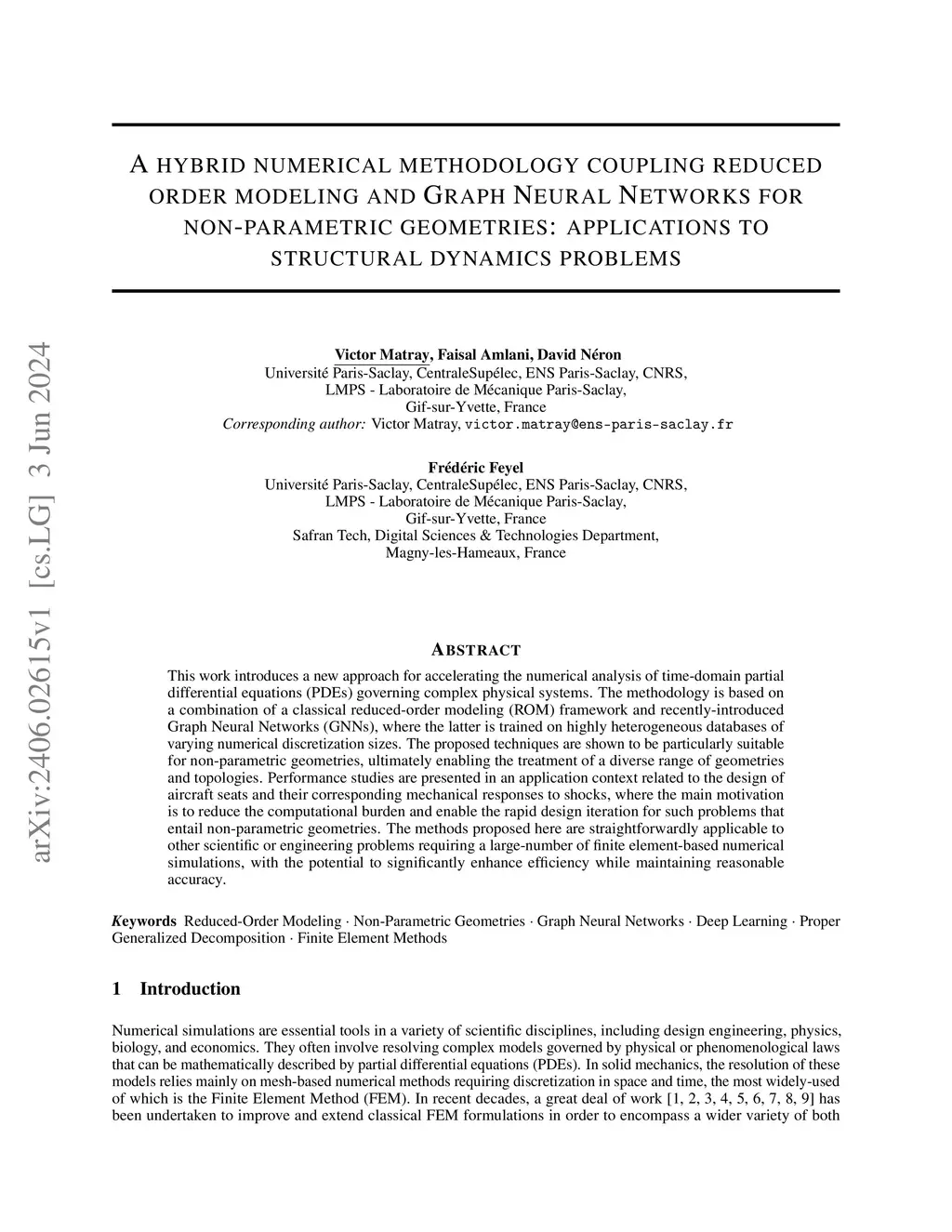 This work introduces a new approach for accelerating the numerical analysis of time-domain partial differential equations (PDEs) governing complex physical systems. The methodology is based on a combination of a classical reduced-order modeling (ROM) framework and recently-introduced Graph Neural Networks (GNNs), where the latter is trained on highly heterogeneous databases of varying numerical discretization sizes. The proposed techniques are shown to be particularly suitable for non-parametric geometries, ultimately enabling the treatment of a diverse range of geometries and topologies. Performance studies are presented in an application context related to the design of aircraft seats and their corresponding mechanical responses to shocks, where the main motivation is to reduce the computational burden and enable the rapid design iteration for such problems that entail non-parametric geometries. The methods proposed here are straightforwardly applicable to other scientific or engineering problems requiring a large number of finite element-based numerical simulations, with the potential to significantly enhance efficiency while maintaining reasonable accuracy.