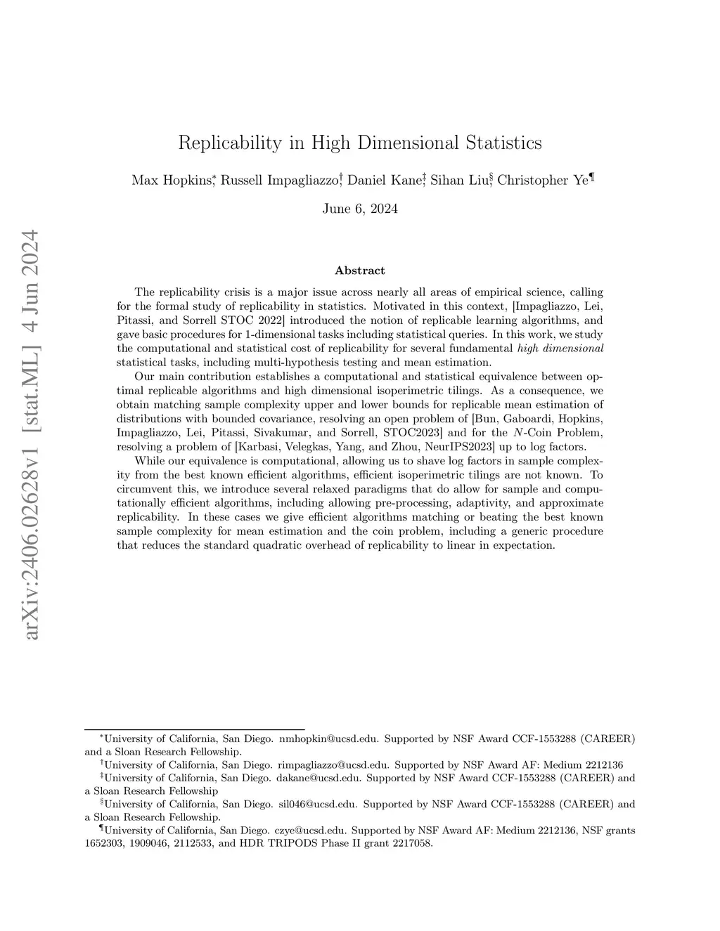 The replicability crisis is a major issue across nearly all areas of empirical science, calling for the formal study of replicability in statistics. Motivated in this context, [Impagliazzo, Lei, Pitassi, and Sorrell STOC 2022] introduced the notion of replicable learning algorithms, and gave basic procedures for -dimensional tasks including statistical queries. In this work, we study the computational and statistical cost of replicability for several fundamental high dimensional statistical tasks, including multi-hypothesis testing and mean estimation. Our main contribution establishes a computational and statistical equivalence between optimal replicable algorithms and high dimensional isoperimetric tilings. As a consequence, we obtain matching sample complexity upper and lower bounds for replicable mean estimation of distributions with bounded covariance, resolving an open problem of [Bun, Gaboardi, Hopkins, Impagliazzo, Lei, Pitassi, Sivakumar, and Sorrell, STOC2023] and for the -Coin Problem, resolving a problem of [Karbasi, Velegkas, Yang, and Zhou, NeurIPS2023] up to log factors. While our equivalence is computational, allowing us to shave log factors in sample complexity from the best known efficient algorithms, efficient isoperimetric tilings are not known. To circumvent this, we introduce several relaxed paradigms that do allow for sample and computationally efficient algorithms, including allowing pre-processing, adaptivity, and approximate replicability. In these cases we give efficient algorithms matching or beating the best known sample complexity for mean estimation and the coin problem, including a generic procedure that reduces the standard quadratic overhead of replicability to linear in expectation.