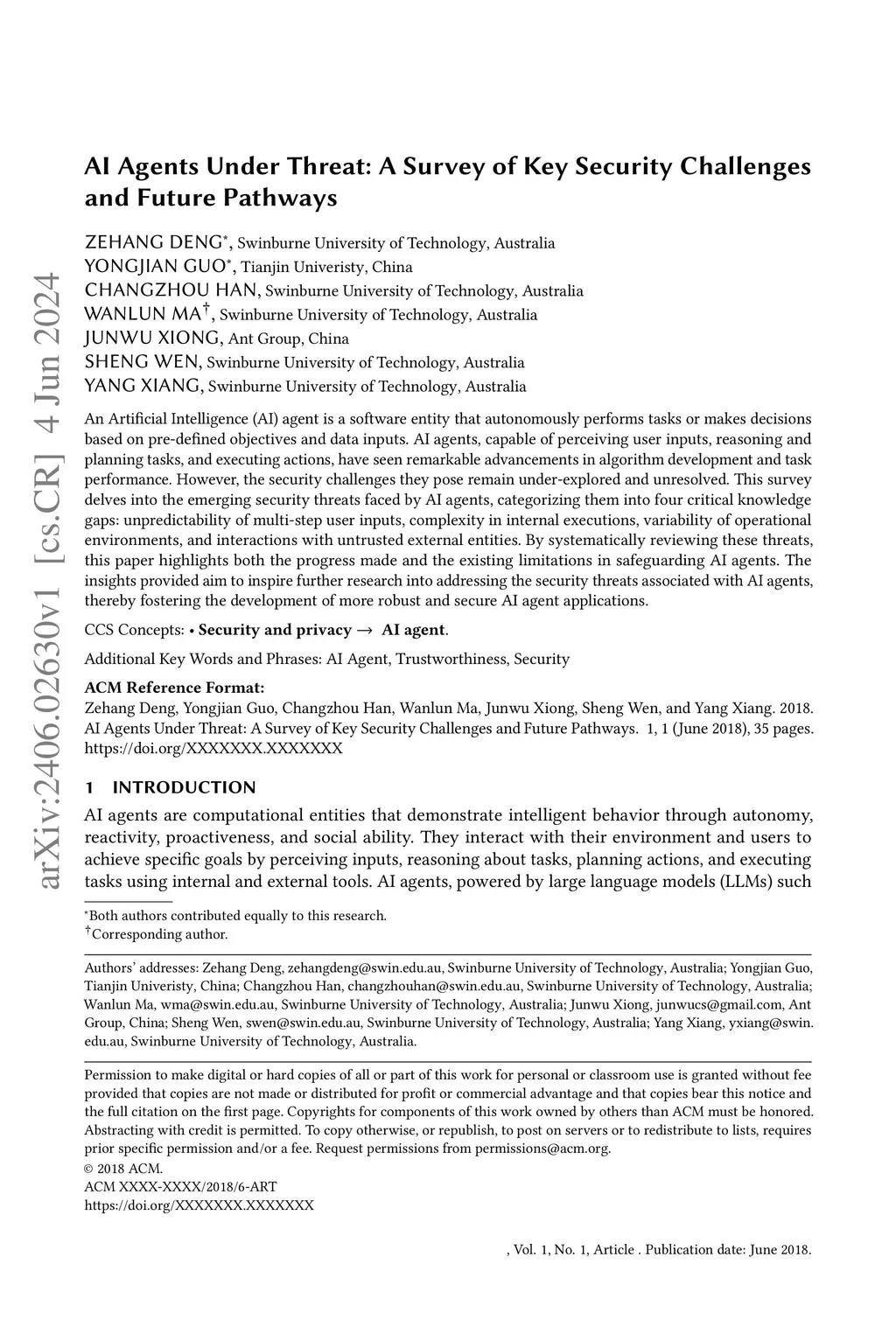 An Artificial Intelligence (AI) agent is a software entity that autonomously performs tasks or makes decisions based on pre-defined objectives and data inputs. AI agents, capable of perceiving user inputs, reasoning and planning tasks, and executing actions, have seen remarkable advancements in algorithm development and task performance. However, the security challenges they pose remain under-explored and unresolved. This survey delves into the emerging security threats faced by AI agents, categorizing them into four critical knowledge gaps: unpredictability of multi-step user inputs, complexity in internal executions, variability of operational environments, and interactions with untrusted external entities. By systematically reviewing these threats, this paper highlights both the progress made and the existing limitations in safeguarding AI agents. The insights provided aim to inspire further research into addressing the security threats associated with AI agents, thereby fostering the development of more robust and secure AI agent applications.