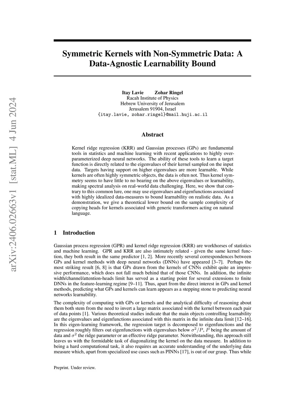 Kernel ridge regression (KRR) and Gaussian processes (GPs) are fundamental tools in statistics and machine learning with recent applications to highly over-parameterized deep neural networks. The ability of these tools to learn a target function is directly related to the eigenvalues of their kernel sampled on the input data. Targets having support on higher eigenvalues are more learnable. While kernels are often highly symmetric objects, the data is often not. Thus kernel symmetry seems to have little to no bearing on the above eigenvalues or learnability, making spectral analysis on real-world data challenging. Here, we show that contrary to this common lure, one may use eigenvalues and eigenfunctions associated with highly idealized data-measures to bound learnability on realistic data. As a demonstration, we give a theoretical lower bound on the sample complexity of copying heads for kernels associated with generic transformers acting on natural language.