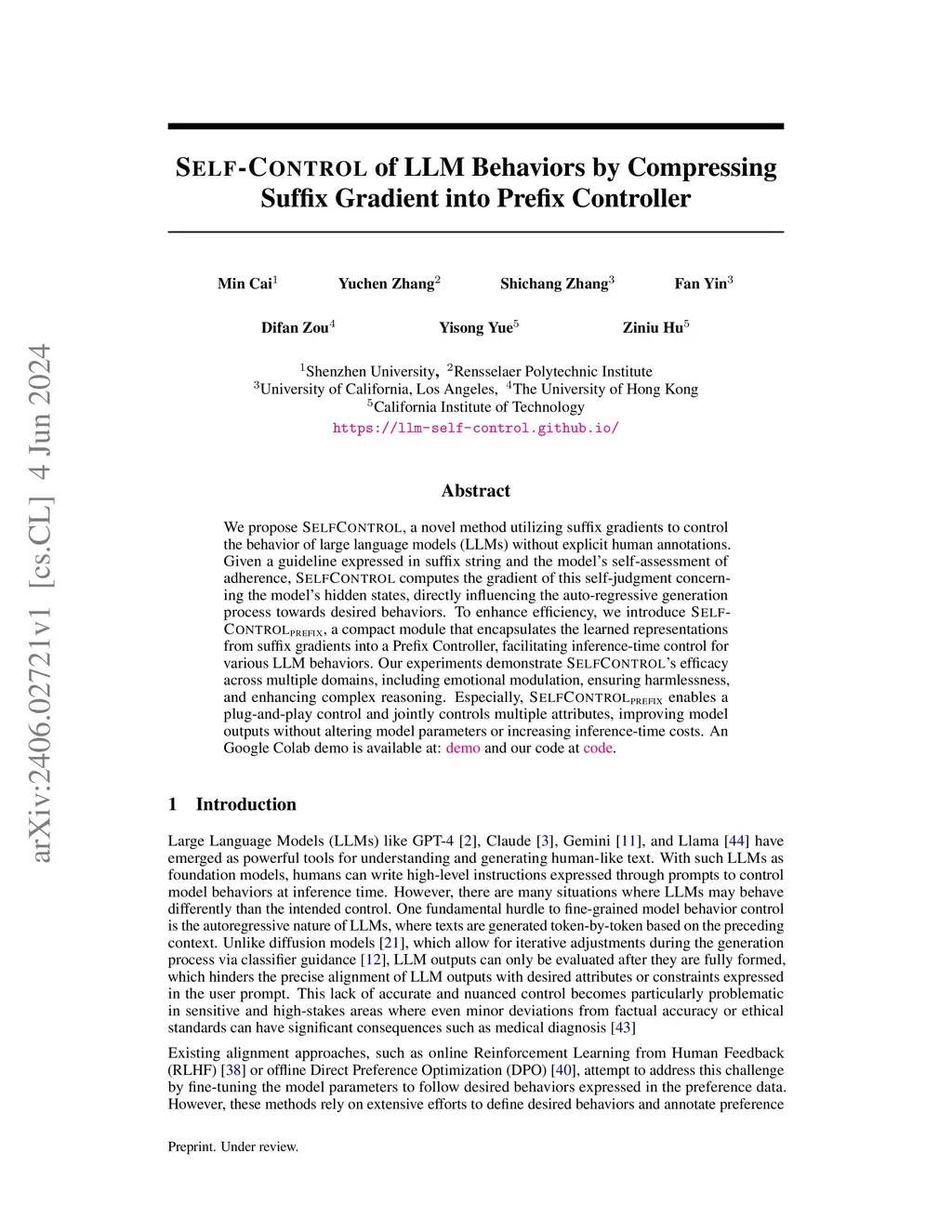 Self-Control of LLM Behaviors by Compressing Suffix Gradient into Prefix