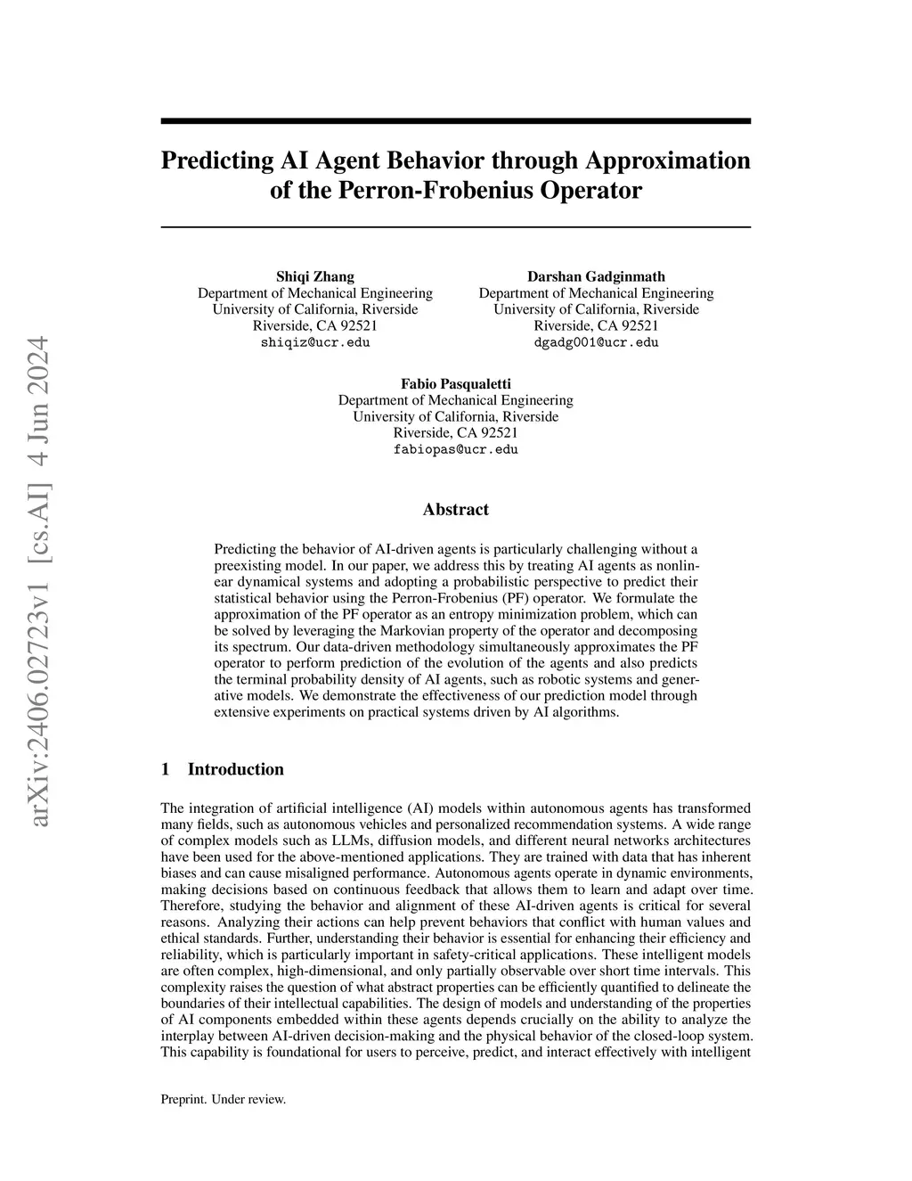 Predicting the behavior of AI-driven agents is particularly challenging without a preexisting model. In our paper, we address this by treating AI agents as nonlinear dynamical systems and adopting a probabilistic perspective to predict their statistical behavior using the Perron-Frobenius (PF) operator. We formulate the approximation of the PF operator as an entropy minimization problem, which can be solved by leveraging the Markovian property of the operator and decomposing its spectrum. Our data-driven methodology simultaneously approximates the PF operator to perform prediction of the evolution of the agents and also predicts the terminal probability density of AI agents, such as robotic systems and generative models. We demonstrate the effectiveness of our prediction model through extensive experiments on practical systems driven by AI algorithms.