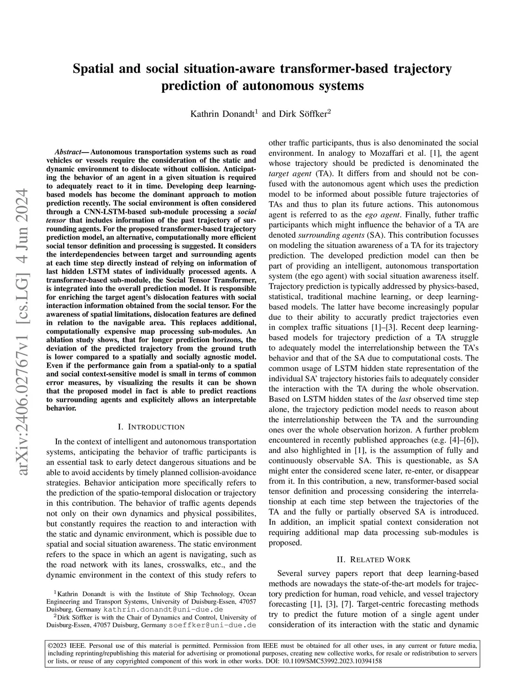 Autonomous transportation systems such as road vehicles or vessels require the consideration of the static and dynamic environment to dislocate without collision. Anticipating the behavior of an agent in a given situation is required to adequately react to it in time. Developing deep learning-based models has become the dominant approach to motion prediction recently. The social environment is often considered through a CNN-LSTM-based sub-module processing a that includes information of the past trajectory of surrounding agents. For the proposed transformer-based trajectory prediction model, an alternative, computationally more efficient social tensor definition and processing is suggested. It considers the interdependencies between target and surrounding agents at each time step directly instead of relying on information of last hidden LSTM states of individually processed agents. A transformer-based sub-module, the Social Tensor Transformer, is integrated into the overall prediction model. It is responsible for enriching the target agent's dislocation features with social interaction information obtained from the social tensor. For the awareness of spatial limitations, dislocation features are defined in relation to the navigable area. This replaces additional, computationally expensive map processing sub-modules. An ablation study shows, that for longer prediction horizons, the deviation of the predicted trajectory from the ground truth is lower compared to a spatially and socially agnostic model. Even if the performance gain from a spatial-only to a spatial and social context-sensitive model is small in terms of common error measures, by visualizing the results it can be shown that the proposed model in fact is able to predict reactions to surrounding agents and explicitely allows an interpretable behavior.