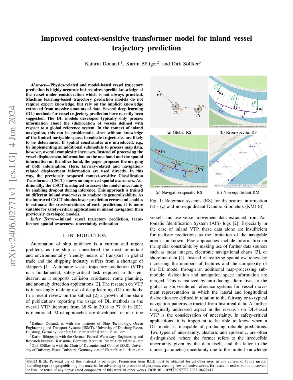 Physics-related and model-based vessel trajectory prediction is highly accurate but requires specific knowledge of the vessel under consideration which is not always practical. Machine learning-based trajectory prediction models do not require expert knowledge, but rely on the implicit knowledge extracted from massive amounts of data. Several deep learning (DL) methods for vessel trajectory prediction have recently been suggested. The DL models developed typically only process information about the (dis)location of vessels defined with respect to a global reference system. In the context of inland navigation, this can be problematic, since without knowledge of the limited navigable space, irrealistic trajectories are likely to be determined. If spatial constraintes are introduced, e.g., by implementing an additional submodule to process map data, however, overall complexity increases. Instead of processing the vessel displacement information on the one hand and the spatial information on the other hand, the paper proposes the merging of both information. Here, fairway-related and navigation-related displacement information are used directly. In this way, the previously proposed context-sensitive Classification Transformer (CSCT) shows an improved spatial awareness. Additionally, the CSCT is adapted to assess the model uncertainty by enabling dropout during inference. This approach is trained on different inland waterways to analyze its generalizability. As the improved CSCT obtains lower prediction errors and enables to estimate the trustworthiness of each prediction, it is more suitable for safety-critical applications in inland navigation than previously developed models.