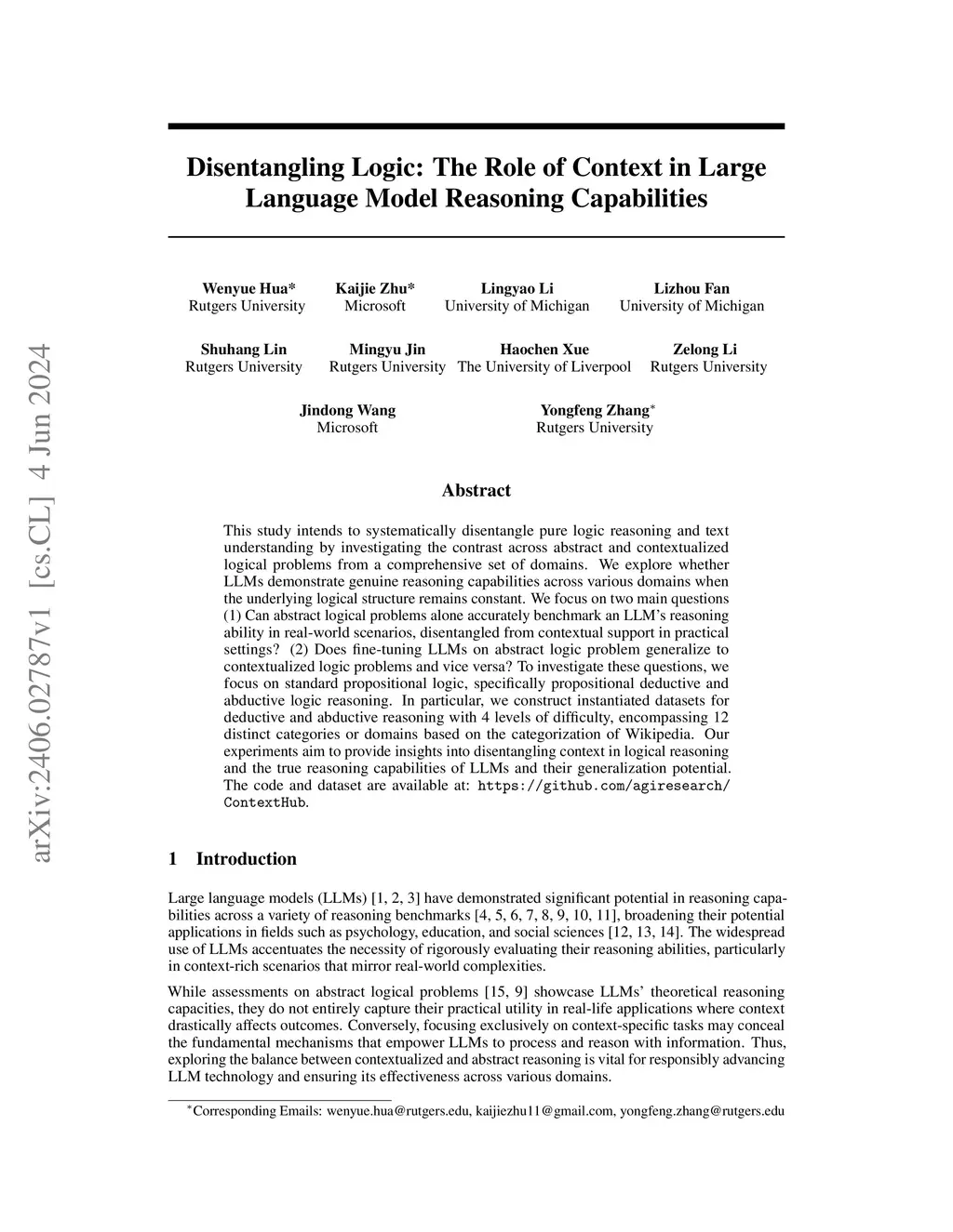 This study intends to systematically disentangle pure logic reasoning and text understanding by investigating the contrast across abstract and contextualized logical problems from a comprehensive set of domains. We explore whether LLMs demonstrate genuine reasoning capabilities across various domains when the underlying logical structure remains constant. We focus on two main questions (1) Can abstract logical problems alone accurately benchmark an LLM's reasoning ability in real-world scenarios, disentangled from contextual support in practical settings? (2) Does fine-tuning LLMs on abstract logic problem generalize to contextualized logic problems and vice versa? To investigate these questions, we focus on standard propositional logic, specifically propositional deductive and abductive logic reasoning. In particular, we construct instantiated datasets for deductive and abductive reasoning with 4 levels of difficulty, encompassing 12 distinct categories or domains based on the categorization of Wikipedia. Our experiments aim to provide insights into disentangling context in logical reasoning and the true reasoning capabilities of LLMs and their generalization potential. The code and dataset are available at: https://github.com/agiresearch/ContextHub.