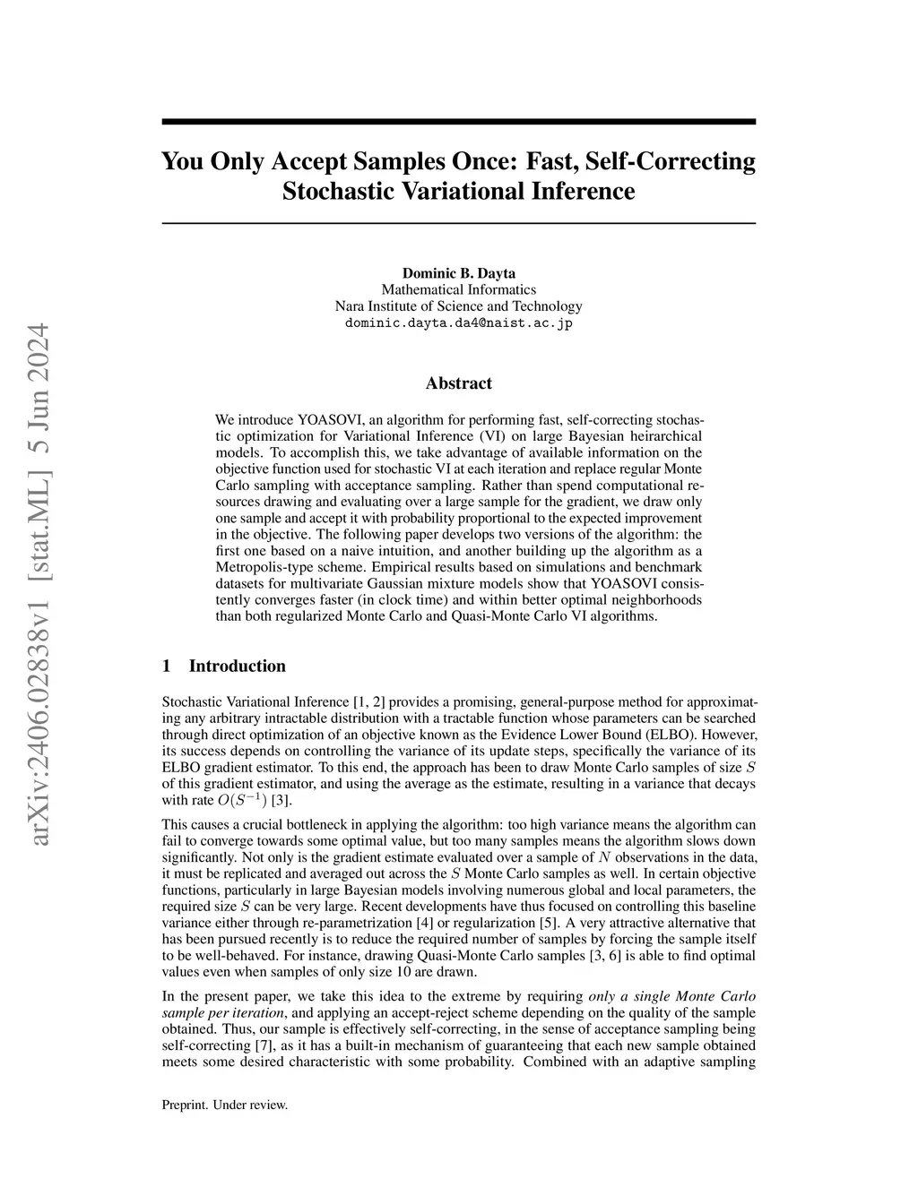 We introduce YOASOVI, an algorithm for performing fast, self-correcting stochastic optimization for Variational Inference (VI) on large Bayesian heirarchical models. To accomplish this, we take advantage of available information on the objective function used for stochastic VI at each iteration and replace regular Monte Carlo sampling with acceptance sampling. Rather than spend computational resources drawing and evaluating over a large sample for the gradient, we draw only one sample and accept it with probability proportional to the expected improvement in the objective. The following paper develops two versions of the algorithm: the first one based on a naive intuition, and another building up the algorithm as a Metropolis-type scheme. Empirical results based on simulations and benchmark datasets for multivariate Gaussian mixture models show that YOASOVI consistently converges faster (in clock time) and within better optimal neighborhoods than both regularized Monte Carlo and Quasi-Monte Carlo VI algorithms.