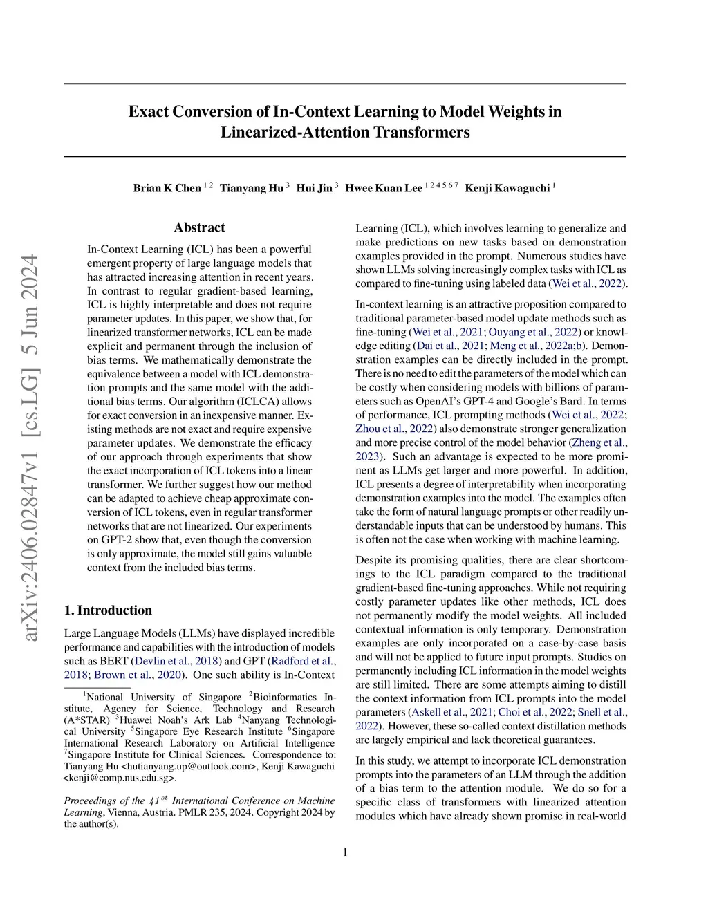 In-Context Learning (ICL) has been a powerful emergent property of large language models that has attracted increasing attention in recent years. In contrast to regular gradient-based learning, ICL is highly interpretable and does not require parameter updates. In this paper, we show that, for linearized transformer networks, ICL can be made explicit and permanent through the inclusion of bias terms. We mathematically demonstrate the equivalence between a model with ICL demonstration prompts and the same model with the additional bias terms. Our algorithm (ICLCA) allows for exact conversion in an inexpensive manner. Existing methods are not exact and require expensive parameter updates. We demonstrate the efficacy of our approach through experiments that show the exact incorporation of ICL tokens into a linear transformer. We further suggest how our method can be adapted to achieve cheap approximate conversion of ICL tokens, even in regular transformer networks that are not linearized. Our experiments on GPT-2 show that, even though the conversion is only approximate, the model still gains valuable context from the included bias terms.