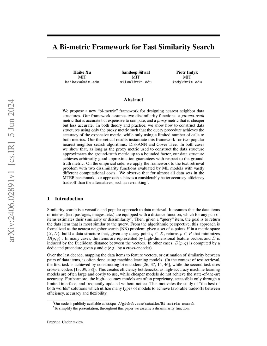 We propose a new "bi-metric" framework for designing nearest neighbor data structures. Our framework assumes two dissimilarity functions: a ground-truth metric that is accurate but expensive to compute, and a proxy metric that is cheaper but less accurate. In both theory and practice, we show how to construct data structures using only the proxy metric such that the query procedure achieves the accuracy of the expensive metric, while only using a limited number of calls to both metrics. Our theoretical results instantiate this framework for two popular nearest neighbor search algorithms: DiskANN and Cover Tree. In both cases we show that, as long as the proxy metric used to construct the data structure approximates the ground-truth metric up to a bounded factor, our data structure achieves arbitrarily good approximation guarantees with respect to the ground-truth metric. On the empirical side, we apply the framework to the text retrieval problem with two dissimilarity functions evaluated by ML models with vastly different computational costs. We observe that for almost all data sets in the MTEB benchmark, our approach achieves a considerably better accuracy-efficiency tradeoff than the alternatives, such as re-ranking.