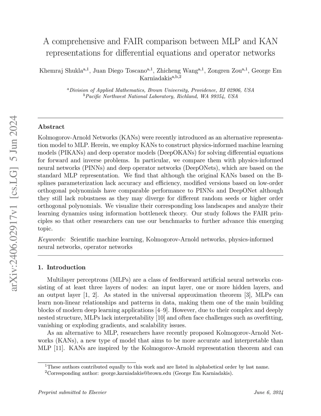 Kolmogorov-Arnold Networks (KANs) were recently introduced as an alternative representation model to MLP. Herein, we employ KANs to construct physics-informed machine learning models (PIKANs) and deep operator models (DeepOKANs) for solving differential equations for forward and inverse problems. In particular, we compare them with physics-informed neural networks (PINNs) and deep operator networks (DeepONets), which are based on the standard MLP representation. We find that although the original KANs based on the B-splines parameterization lack accuracy and efficiency, modified versions based on low-order orthogonal polynomials have comparable performance to PINNs and DeepONet although they still lack robustness as they may diverge for different random seeds or higher order orthogonal polynomials. We visualize their corresponding loss landscapes and analyze their learning dynamics using information bottleneck theory. Our study follows the FAIR principles so that other researchers can use our benchmarks to further advance this emerging topic.