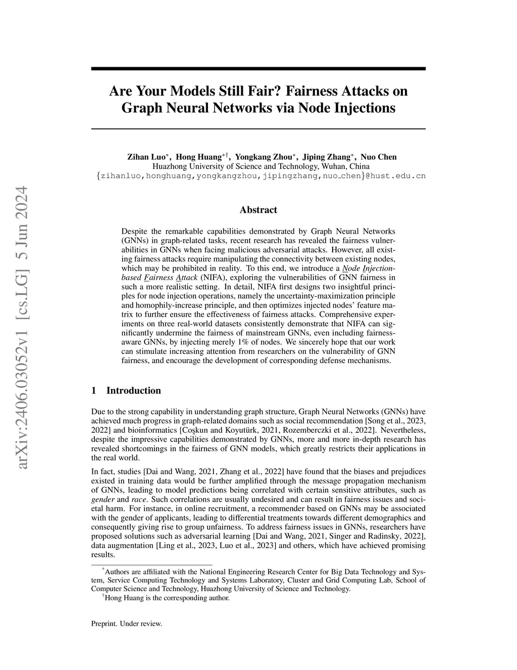 Despite the remarkable capabilities demonstrated by Graph Neural Networks (GNNs) in graph-related tasks, recent research has revealed the fairness vulnerabilities in GNNs when facing malicious adversarial attacks. However, all existing fairness attacks require manipulating the connectivity between existing nodes, which may be prohibited in reality. To this end, we introduce a Node Injection-based Fairness Attack (NIFA), exploring the vulnerabilities of GNN fairness in such a more realistic setting. In detail, NIFA first designs two insightful principles for node injection operations, namely the uncertainty-maximization principle and homophily-increase principle, and then optimizes injected nodes' feature matrix to further ensure the effectiveness of fairness attacks. Comprehensive experiments on three real-world datasets consistently demonstrate that NIFA can significantly undermine the fairness of mainstream GNNs, even including fairness-aware GNNs, by injecting merely 1% of nodes. We sincerely hope that our work can stimulate increasing attention from researchers on the vulnerability of GNN fairness, and encourage the development of corresponding defense mechanisms.