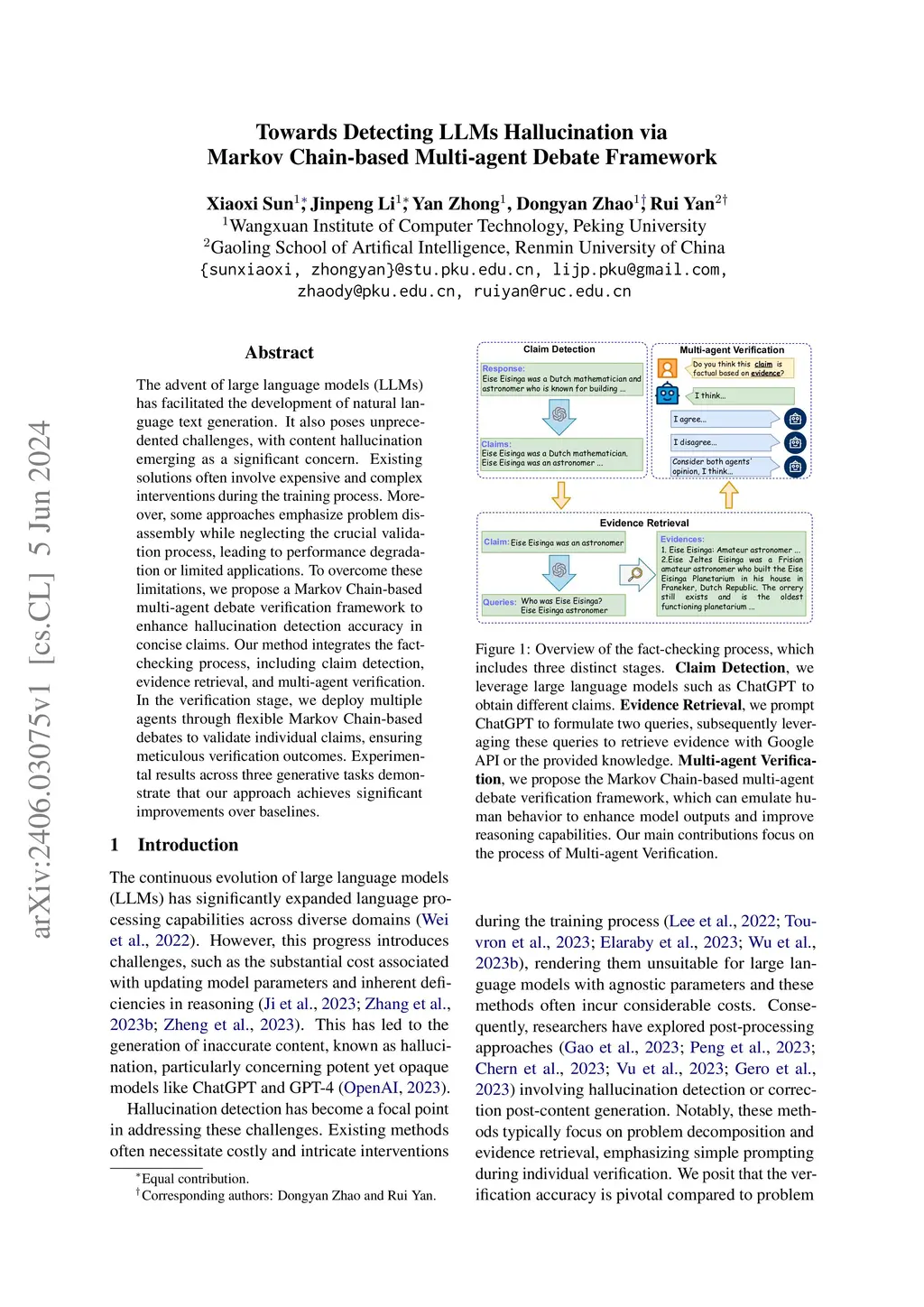 The advent of large language models (LLMs) has facilitated the development of natural language text generation. It also poses unprecedented challenges, with content hallucination emerging as a significant concern. Existing solutions often involve expensive and complex interventions during the training process. Moreover, some approaches emphasize problem disassembly while neglecting the crucial validation process, leading to performance degradation or limited applications. To overcome these limitations, we propose a Markov Chain-based multi-agent debate verification framework to enhance hallucination detection accuracy in concise claims. Our method integrates the fact-checking process, including claim detection, evidence retrieval, and multi-agent verification. In the verification stage, we deploy multiple agents through flexible Markov Chain-based debates to validate individual claims, ensuring meticulous verification outcomes. Experimental results across three generative tasks demonstrate that our approach achieves significant improvements over baselines.