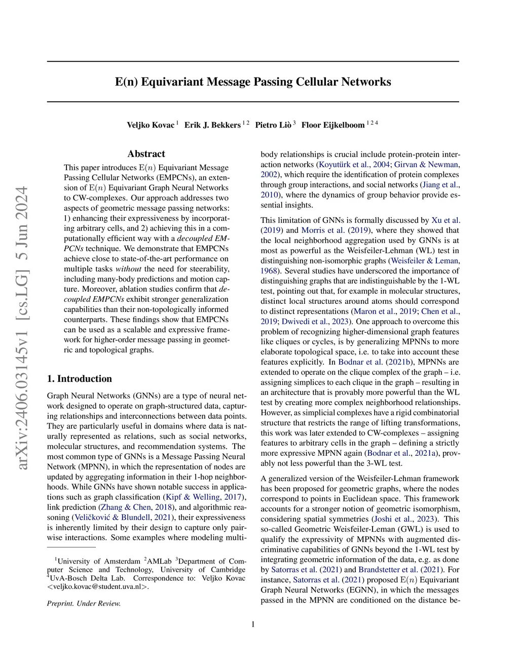This paper introduces E(n) Equivariant Message Passing Cellular Networks (EMPCNs), an extension of E(n) Equivariant Graph Neural Networks to CW-complexes. Our approach addresses two aspects of geometric message passing networks: 1) enhancing their expressiveness by incorporating arbitrary cells, and 2) achieving this in a computationally efficient way with a decoupled EMPCNs technique. We demonstrate that EMPCNs achieve close to state-of-the-art performance on multiple tasks without the need for steerability, including many-body predictions and motion capture. Moreover, ablation studies confirm that decoupled EMPCNs exhibit stronger generalization capabilities than their non-topologically informed counterparts. These findings show that EMPCNs can be used as a scalable and expressive framework for higher-order message passing in geometric and topological graphs