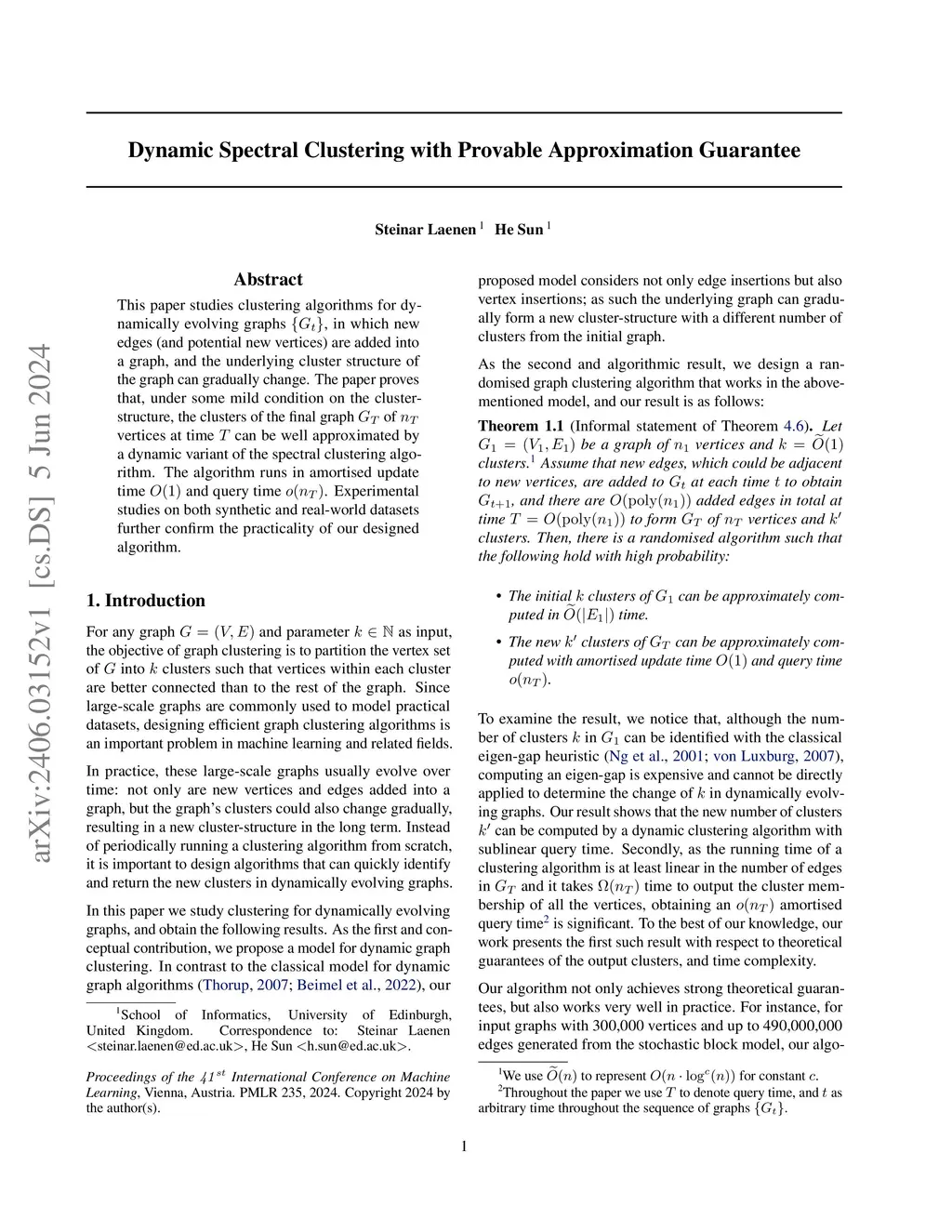 This paper studies clustering algorithms for dynamically evolving graphs , in which new edges (and potential new vertices) are added into a graph, and the underlying cluster structure of the graph can gradually change. The paper proves that, under some mild condition on the cluster-structure, the clusters of the final graph of vertices at time can be well approximated by a dynamic variant of the spectral clustering algorithm. The algorithm runs in amortised update time and query time . Experimental studies on both synthetic and real-world datasets further confirm the practicality of our designed algorithm.
