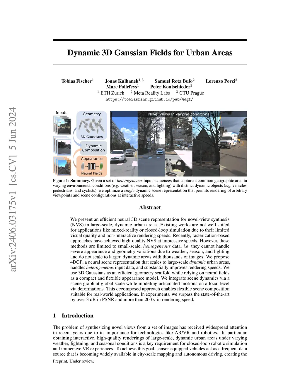 We present an efficient neural 3D scene representation for novel-view synthesis (NVS) in large-scale, dynamic urban areas. Existing works are not well suited for applications like mixed-reality or closed-loop simulation due to their limited visual quality and non-interactive rendering speeds. Recently, rasterization-based approaches have achieved high-quality NVS at impressive speeds. However, these methods are limited to small-scale, homogeneous data, i.e. they cannot handle severe appearance and geometry variations due to weather, season, and lighting and do not scale to larger, dynamic areas with thousands of images. We propose 4DGF, a neural scene representation that scales to large-scale dynamic urban areas, handles heterogeneous input data, and substantially improves rendering speeds. We use 3D Gaussians as an efficient geometry scaffold while relying on neural fields as a compact and flexible appearance model. We integrate scene dynamics via a scene graph at global scale while modeling articulated motions on a local level via deformations. This decomposed approach enables flexible scene composition suitable for real-world applications. In experiments, we surpass the state-of-the-art by over 3 dB in PSNR and more than 200 times in rendering speed.