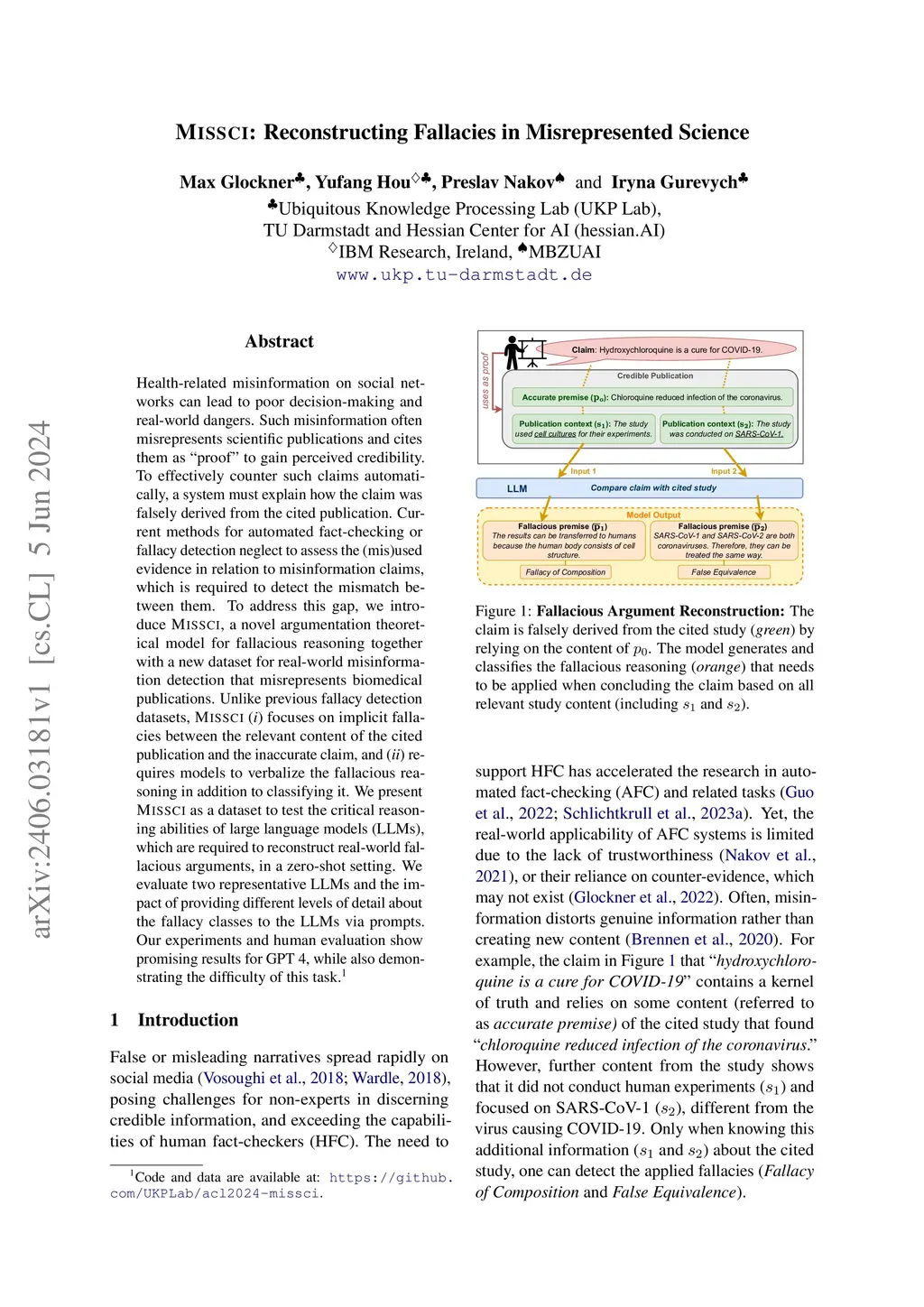 Health-related misinformation on social networks can lead to poor decision-making and real-world dangers. Such misinformation often misrepresents scientific publications and cites them as "proof" to gain perceived credibility. To effectively counter such claims automatically, a system must explain how the claim was falsely derived from the cited publication. Current methods for automated fact-checking or fallacy detection neglect to assess the (mis)used evidence in relation to misinformation claims, which is required to detect the mismatch between them. To address this gap, we introduce Missci, a novel argumentation theoretical model for fallacious reasoning together with a new dataset for real-world misinformation detection that misrepresents biomedical publications. Unlike previous fallacy detection datasets, Missci (i) focuses on implicit fallacies between the relevant content of the cited publication and the inaccurate claim, and (ii) requires models to verbalize the fallacious reasoning in addition to classifying it. We present Missci as a dataset to test the critical reasoning abilities of large language models (LLMs), that are required to reconstruct real-world fallacious arguments, in a zero-shot setting. We evaluate two representative LLMs and the impact of different levels of detail about the fallacy classes provided to the LLM via prompts. Our experiments and human evaluation show promising results for GPT 4, while also demonstrating the difficulty of this task.
