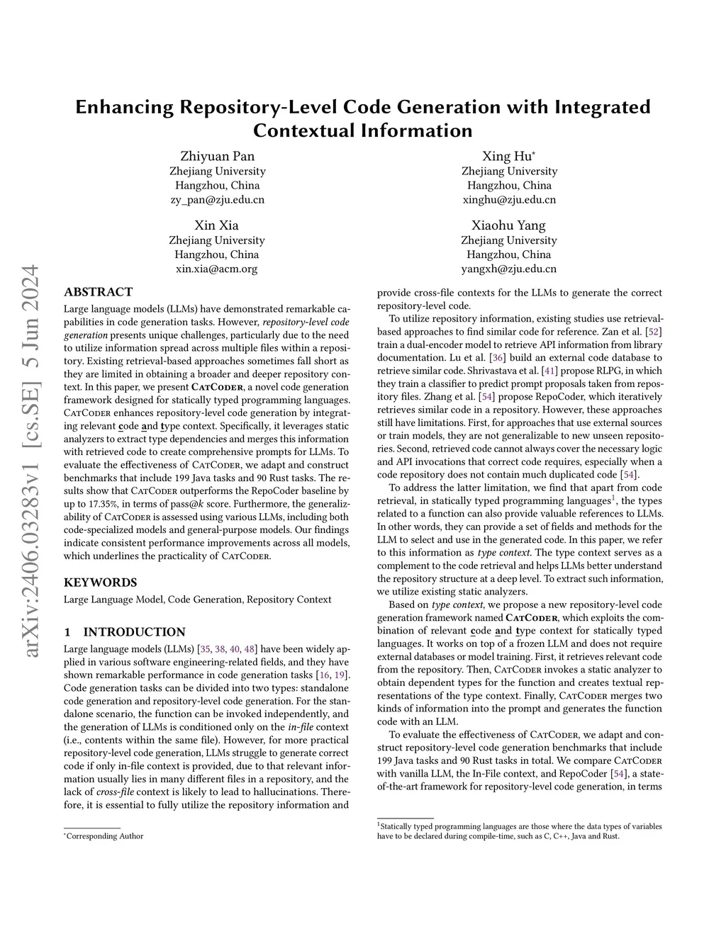 Large language models (LLMs) have demonstrated remarkable capabilities in code generation tasks. However, repository-level code generation presents unique challenges, particularly due to the need to utilize information spread across multiple files within a repository. Existing retrieval-based approaches sometimes fall short as they are limited in obtaining a broader and deeper repository context. In this paper, we present CatCoder, a novel code generation framework designed for statically typed programming languages. CatCoder enhances repository-level code generation by integrating relevant code and type context. Specifically, it leverages static analyzers to extract type dependencies and merges this information with retrieved code to create comprehensive prompts for LLMs. To evaluate the effectiveness of CatCoder, we adapt and construct benchmarks that include 199 Java tasks and 90 Rust tasks. The results show that CatCoder outperforms the RepoCoder baseline by up to 17.35%, in terms of pass@k score. Furthermore, the generalizability of CatCoder is assessed using various LLMs, including both code-specialized models and general-purpose models. Our findings indicate consistent performance improvements across all models, which underlines the practicality of CatCoder.